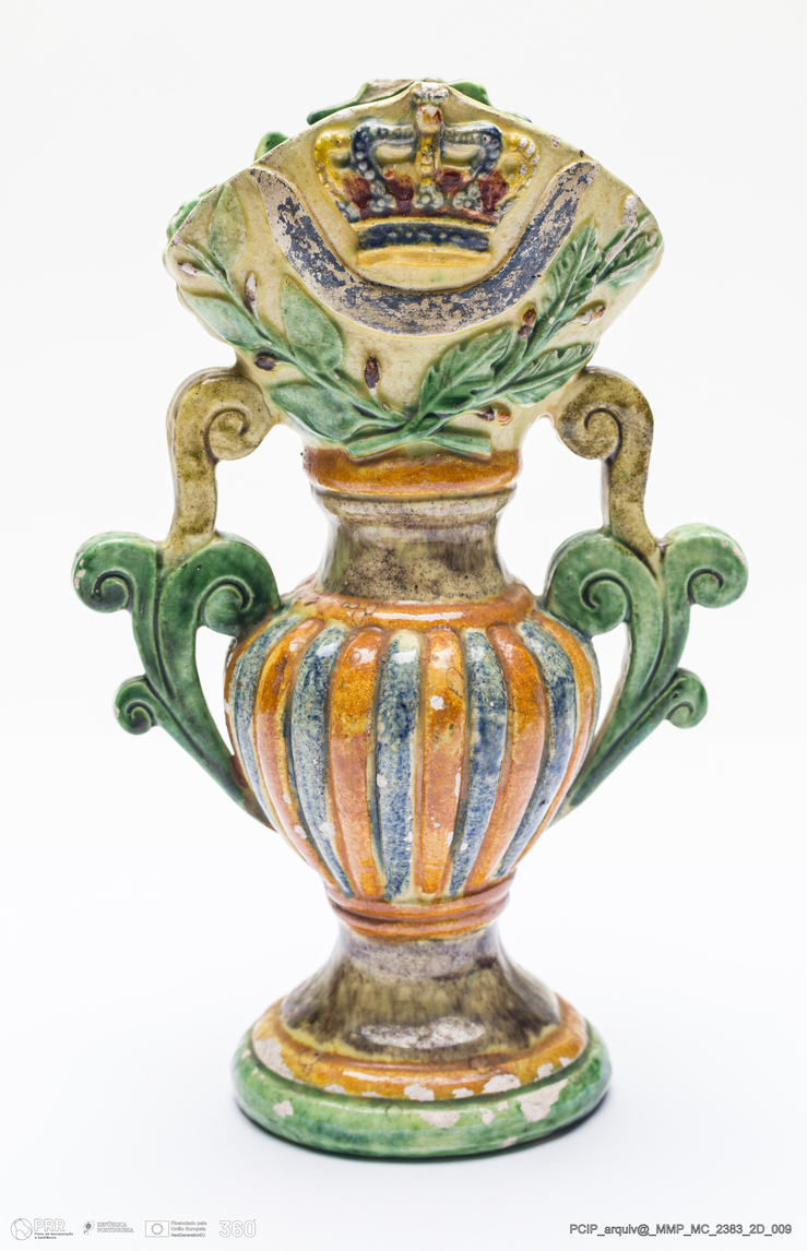Matéria/Técnica: Barro moldado. Vidrado verde, amarelo e castanho; Cronologia: século XIX; Autoria: Atribuído a Manuel Cipriano Gomes Mafra, Caldas da Rainha; Dimensões (cm): Altura: 18.