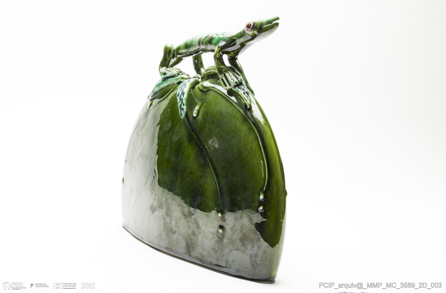 Matéria/Técnica: Barro branco moldado. Vidrado polícromo castanho e verde; Cronologia: 2007; Autoria: Mirta Morigi, Faenza; Dimensões (cm): Altura: 23; Largura: 8,5; Comprimento:23.