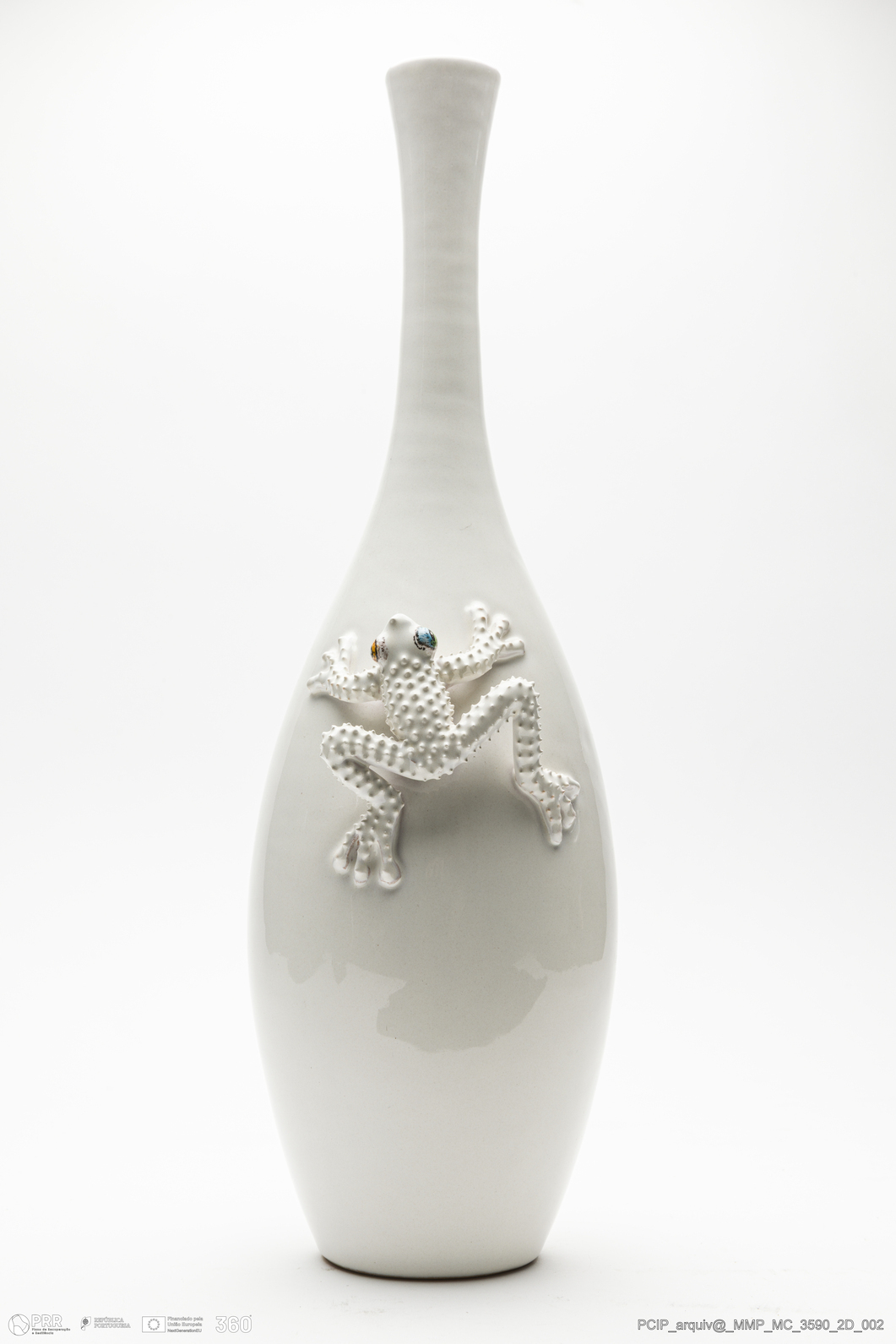 Matéria/Técnica: Barro vermelho moldado. Vidrado monocromo a branco; Cronologia: século XXI; Autoria: Mirta Morigi, Faenza; Dimensões (cm): Altura: 38,5; Diâmetro: 12.