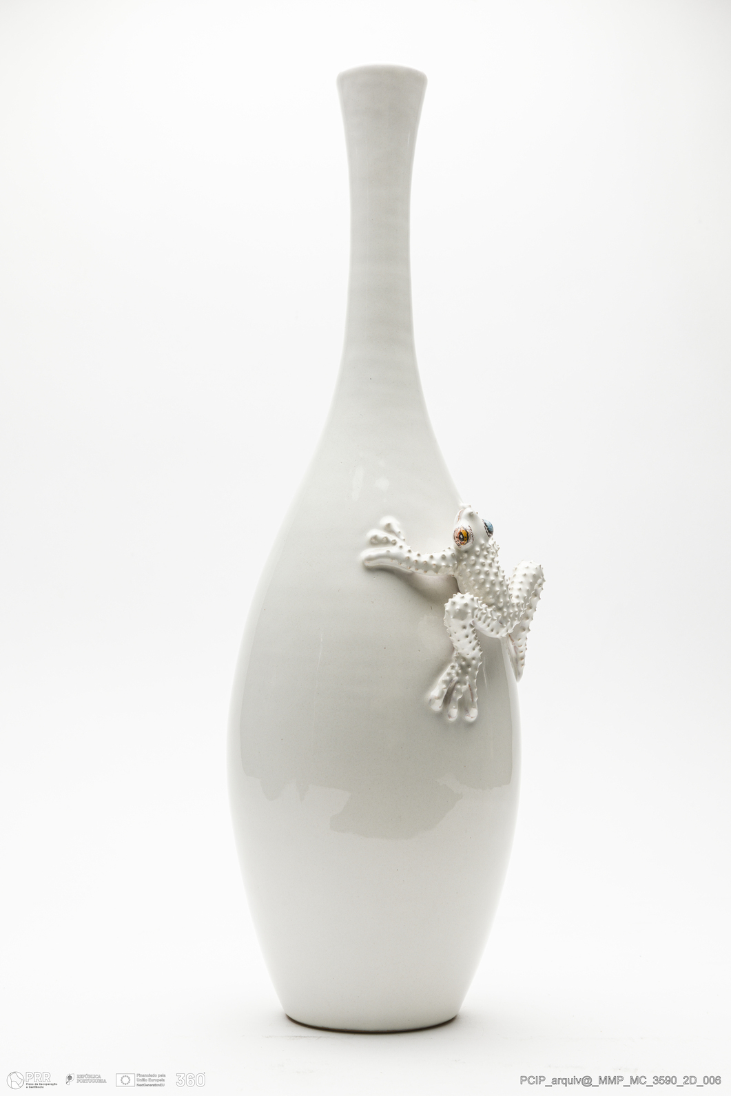Matéria/Técnica: Barro vermelho moldado. Vidrado monocromo a branco; Cronologia: século XXI; Autoria: Mirta Morigi, Faenza; Dimensões (cm): Altura: 38,5; Diâmetro: 12.