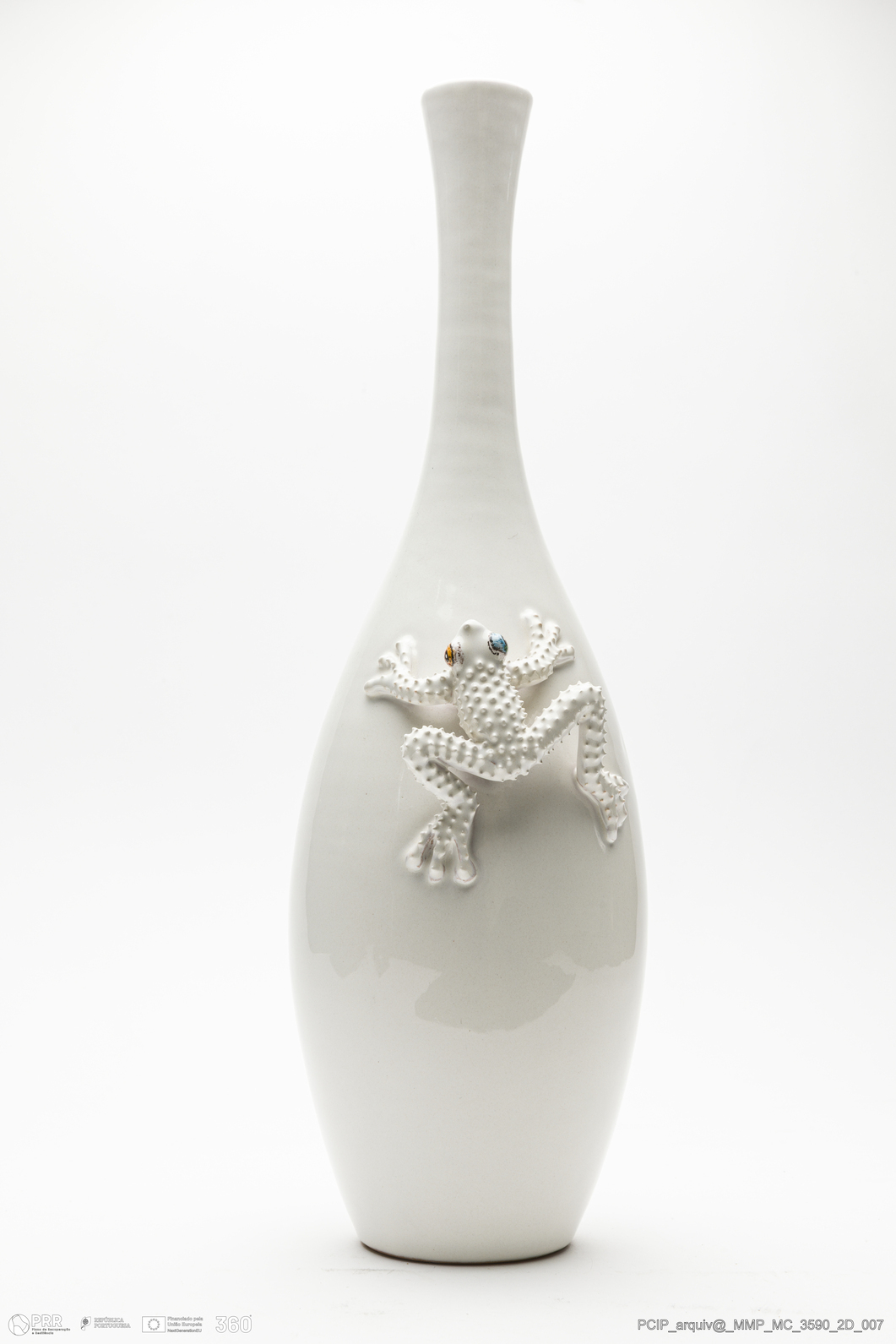 Matéria/Técnica: Barro vermelho moldado. Vidrado monocromo a branco; Cronologia: século XXI; Autoria: Mirta Morigi, Faenza; Dimensões (cm): Altura: 38,5; Diâmetro: 12.