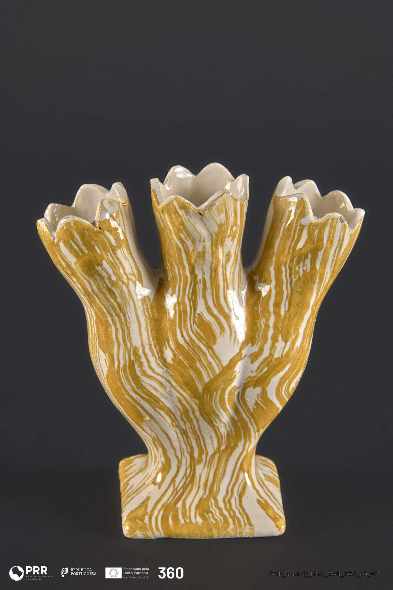 Matéria/Técnica: Faiança moldada e vidrada com decoração pintada a amarelo sobre fundo branco; Cronologia: Desconhecida; Autoria: Desconhecida; Dimensões: Desconhecidas.