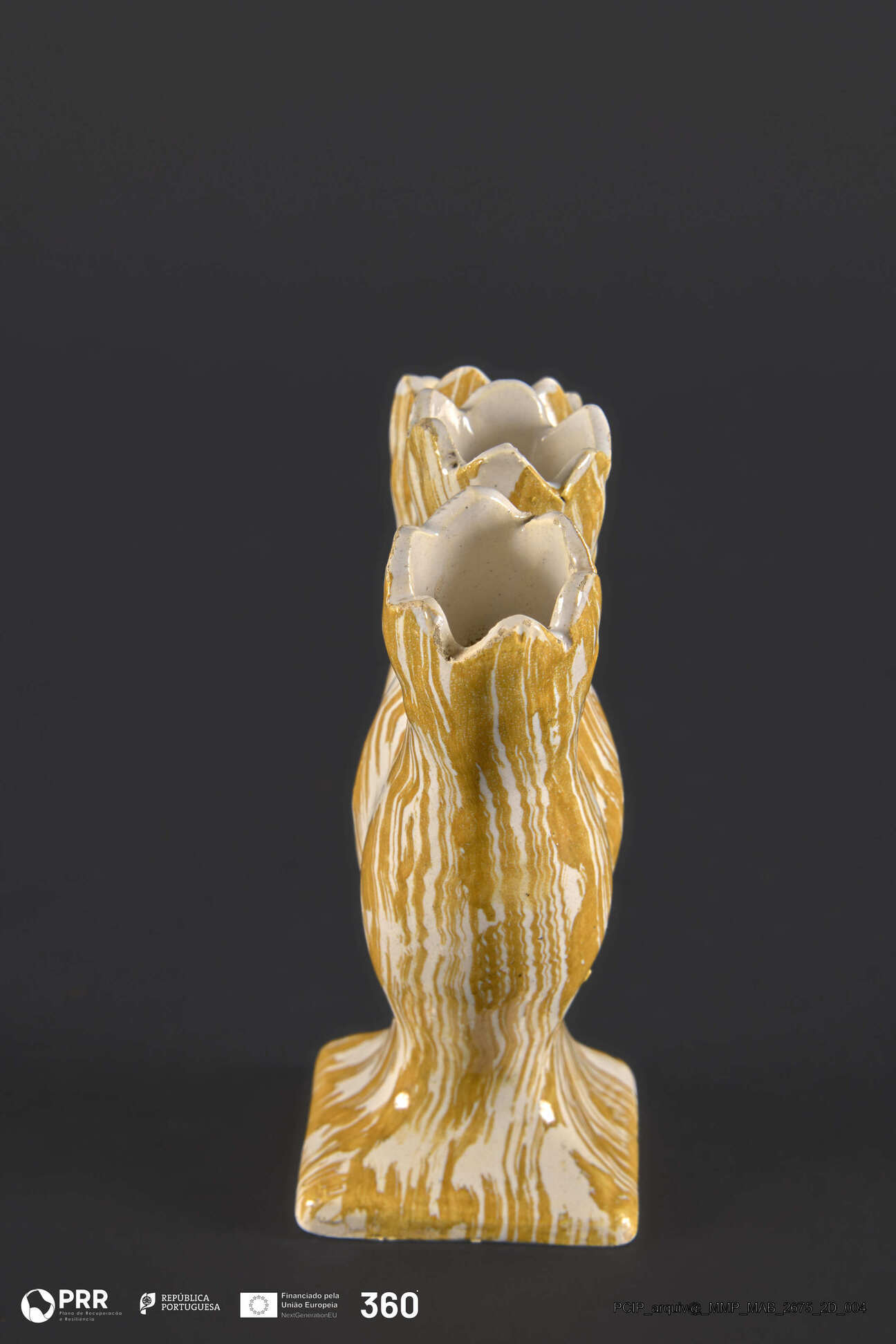 Matéria/Técnica: Faiança moldada e vidrada com decoração pintada a amarelo sobre fundo branco; Cronologia: Desconhecida; Autoria: Desconhecida; Dimensões: Desconhecidas.