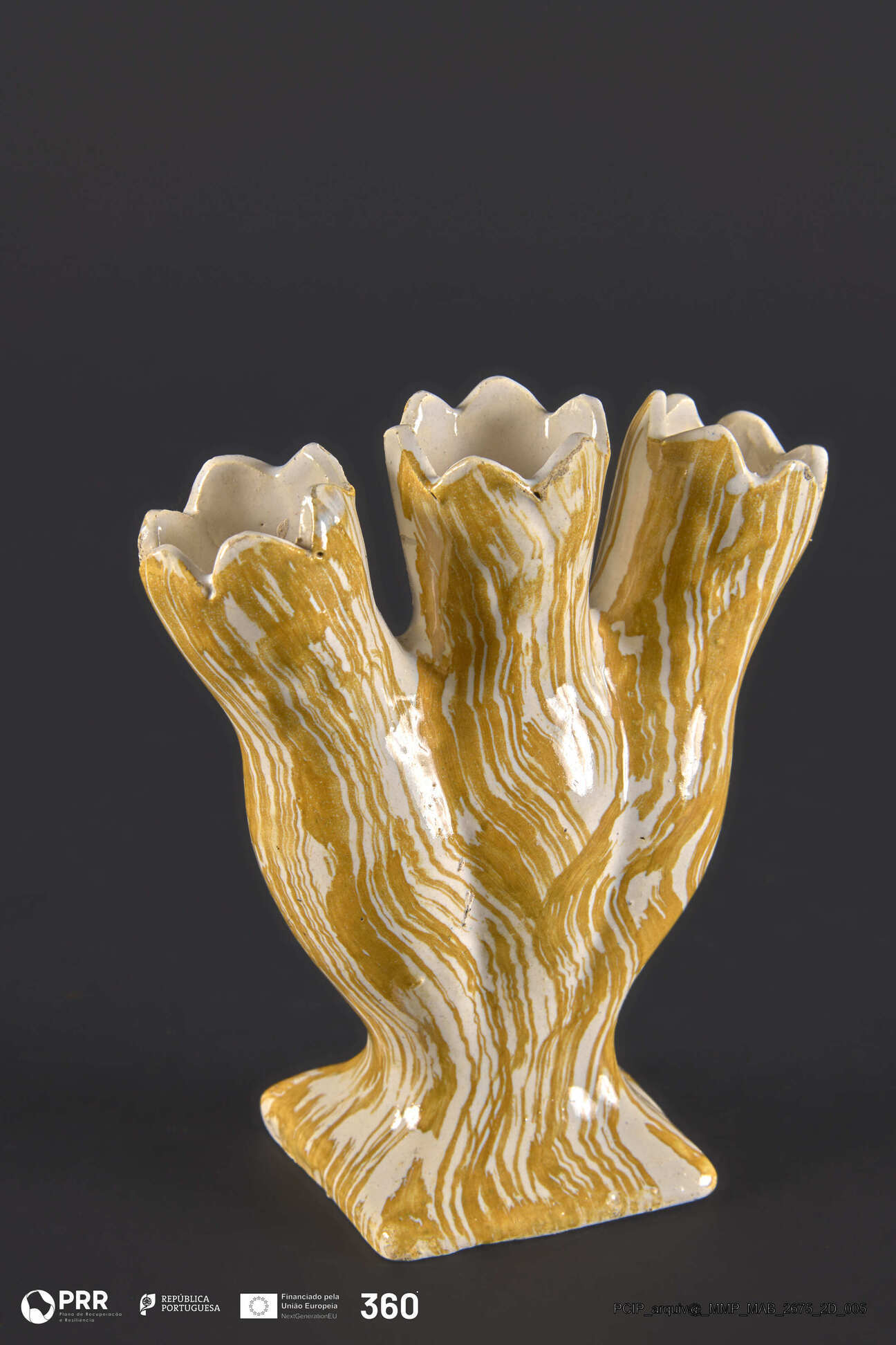 Matéria/Técnica: Faiança moldada e vidrada com decoração pintada a amarelo sobre fundo branco; Cronologia: Desconhecida; Autoria: Desconhecida; Dimensões: Desconhecidas.