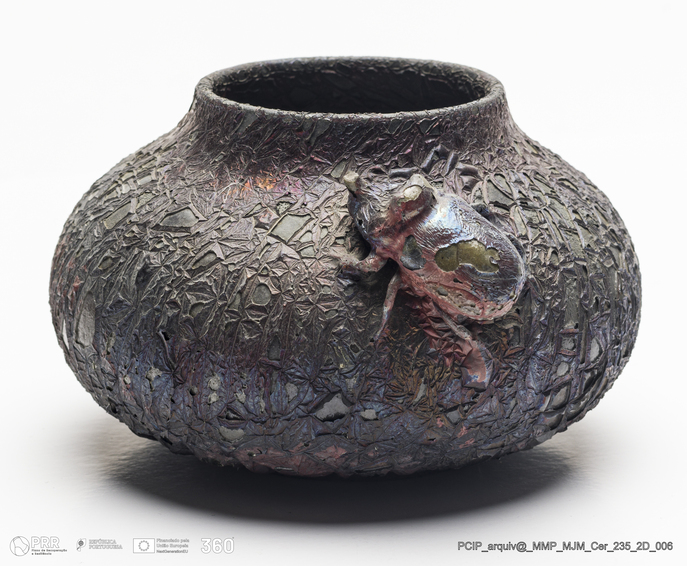 Matéria/Técnica: Barro metalizado; Cronologia: Desconhecida; Autoria: Trabalho experimental de Rafael Bordalo Pinheiro; Dimensões: Comprimento: 8,2 x Altura: 18,8 x Largura: 3,4 cm.