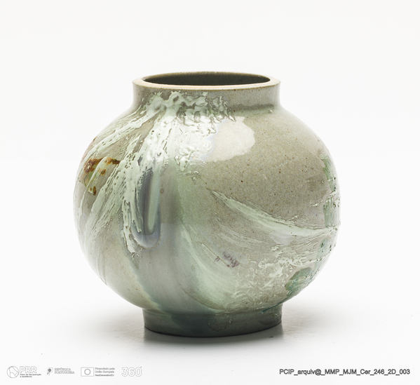 Matéria/Técnica: Faiança decorada a ouro; Cronologia: 1903; Autoria: Rafael Bordalo Pinheiro; Dimensões: Altura: 6,4 x Diâmetro: 6,9 cm.