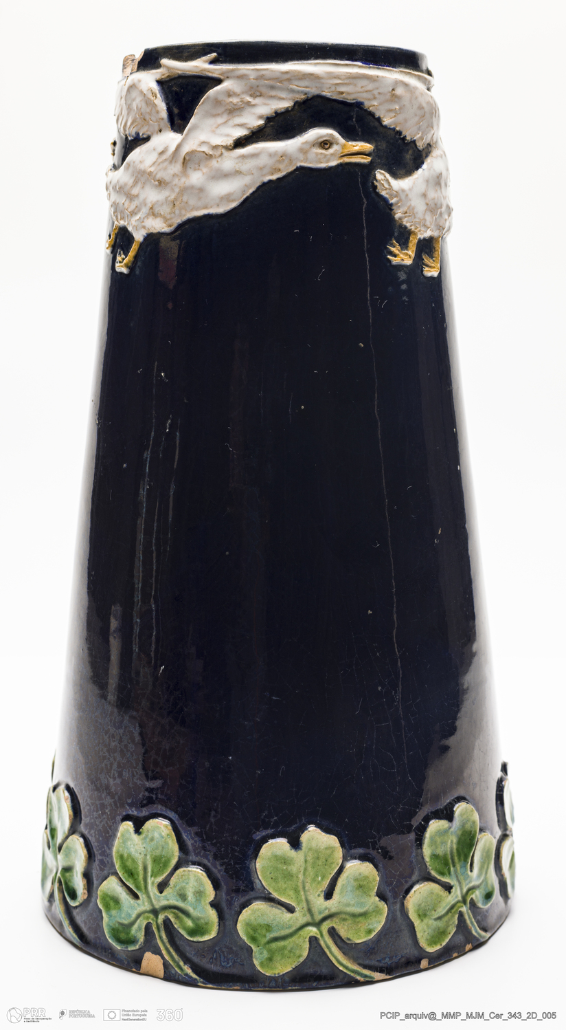Matéria/Técnica: Barro vidrado; Cronologia: Desconhecida; Autoria: Manuel Gustavo Bordalo Pinheiro; Dimensões: Altura: 21 boca 17 cm.
