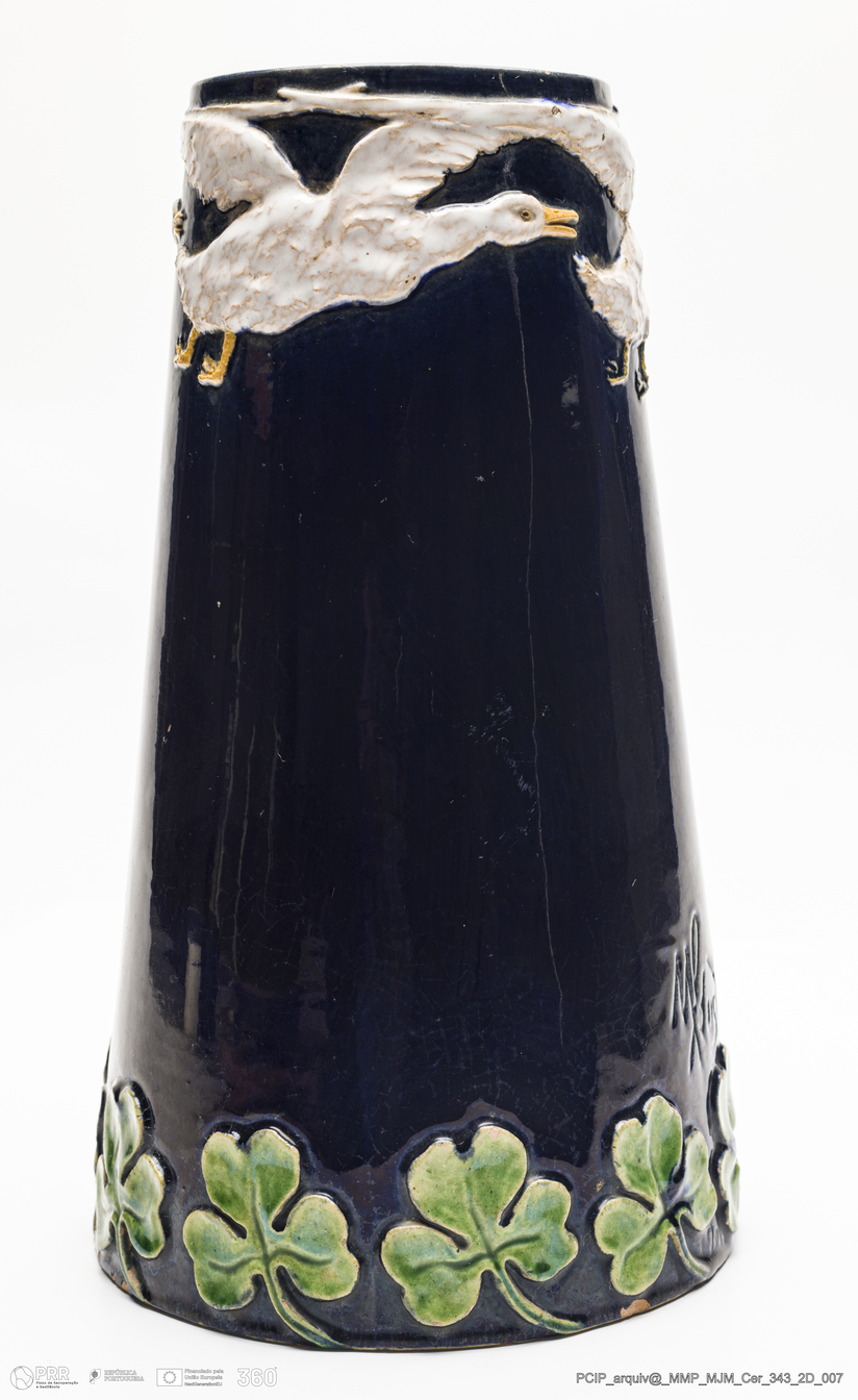 Matéria/Técnica: Barro vidrado; Cronologia: Desconhecida; Autoria: Manuel Gustavo Bordalo Pinheiro; Dimensões: Altura: 21 boca 17 cm.