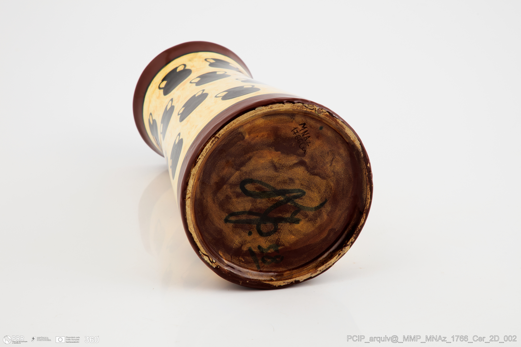 Matéria/Técnica: Faiança; Cronologia: ass.e dat. 58; Autoria: Artur José; Viúva Lamego; Dimensões: Altura: 24 cm x Diam. 13,5 cm.
