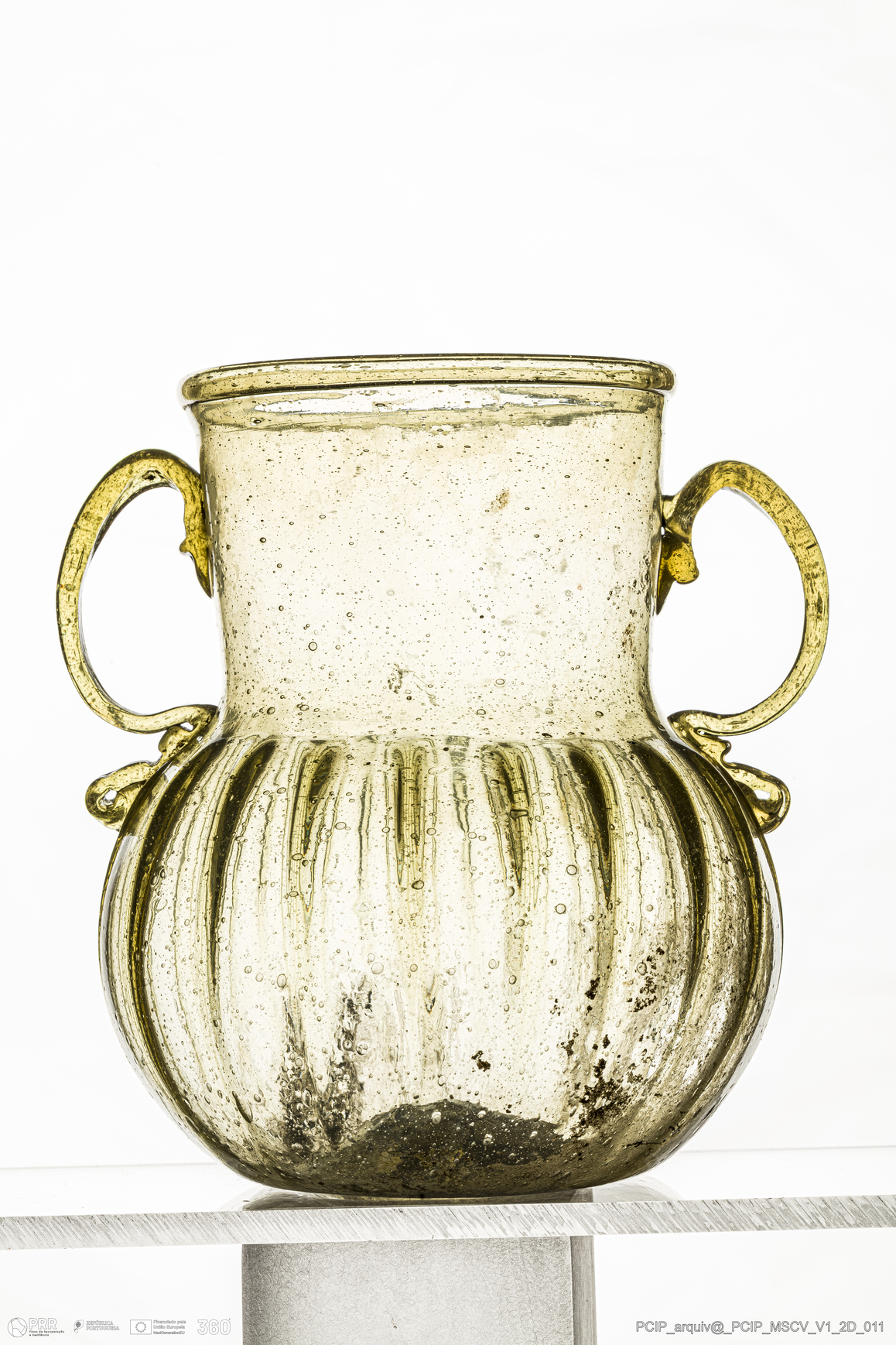 Matéria/Técnica: Vidro; Cronologia: Século XVII; Autoria: Desconhecida; Dimensões: Diâmetro bordo: 78mm; Diâmetro: 121mm Diâmetro base: 60mm; Altura: 120mm.