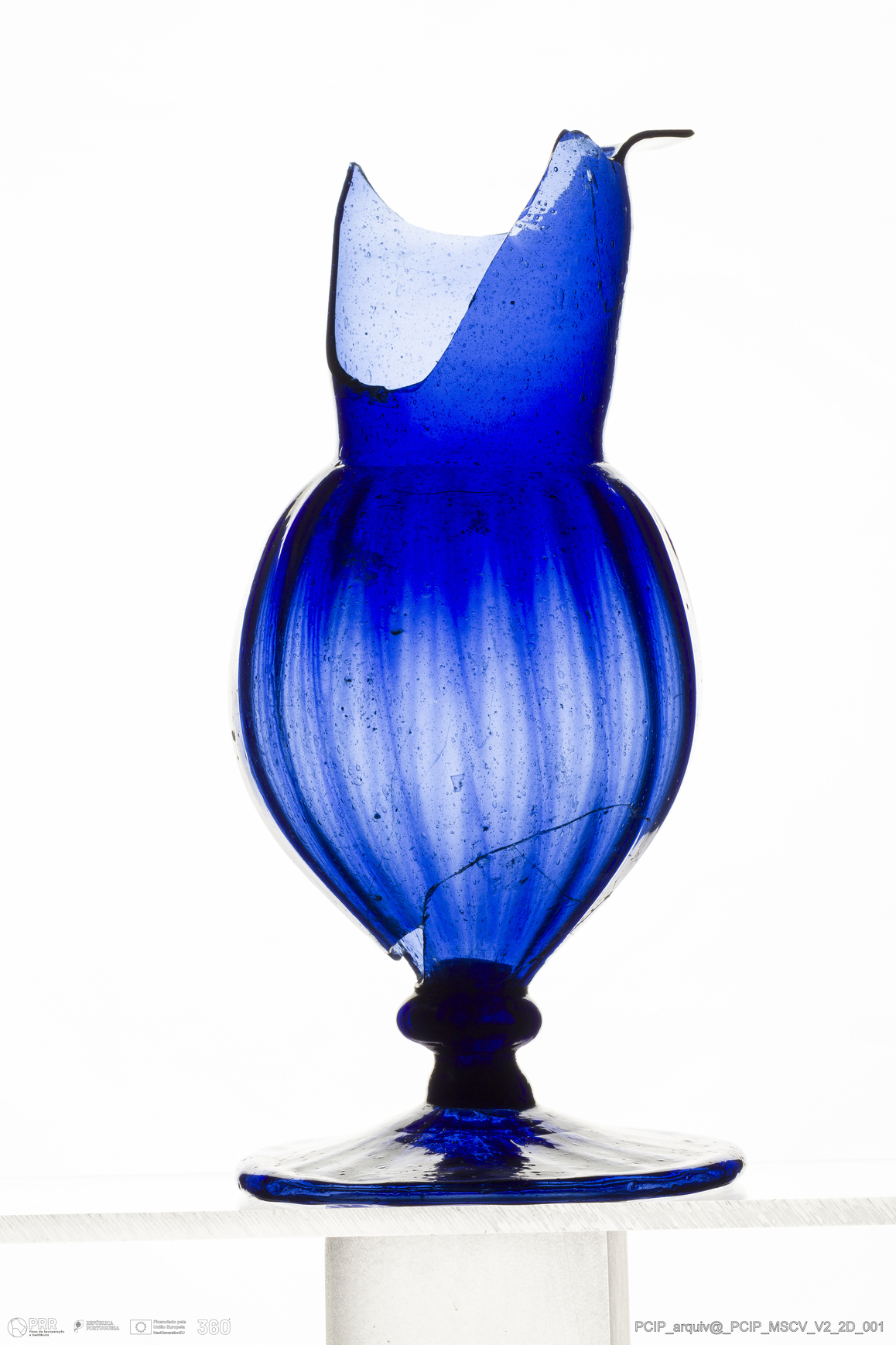 Matéria/Técnica: Vidro; Cronologia: Século XVII; Autoria: Desconhecida; Dimensões: Altura: 190mm; Diâmetro da base: 93mm.