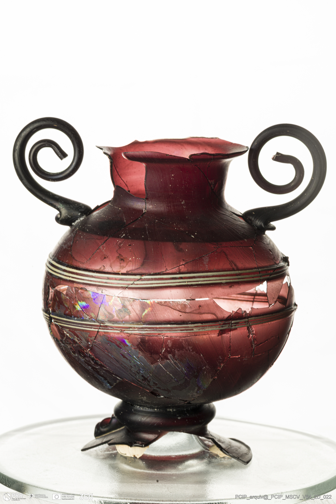 Matéria/Técnica: Vidro; Cronologia: Século XVII; Autoria: Desconhecida; Dimensões: Altura: 100mm; Diâmetro máximo: 89mm; Diâmetro da base: 62mm; Diâmetro do bordo: 56mm.