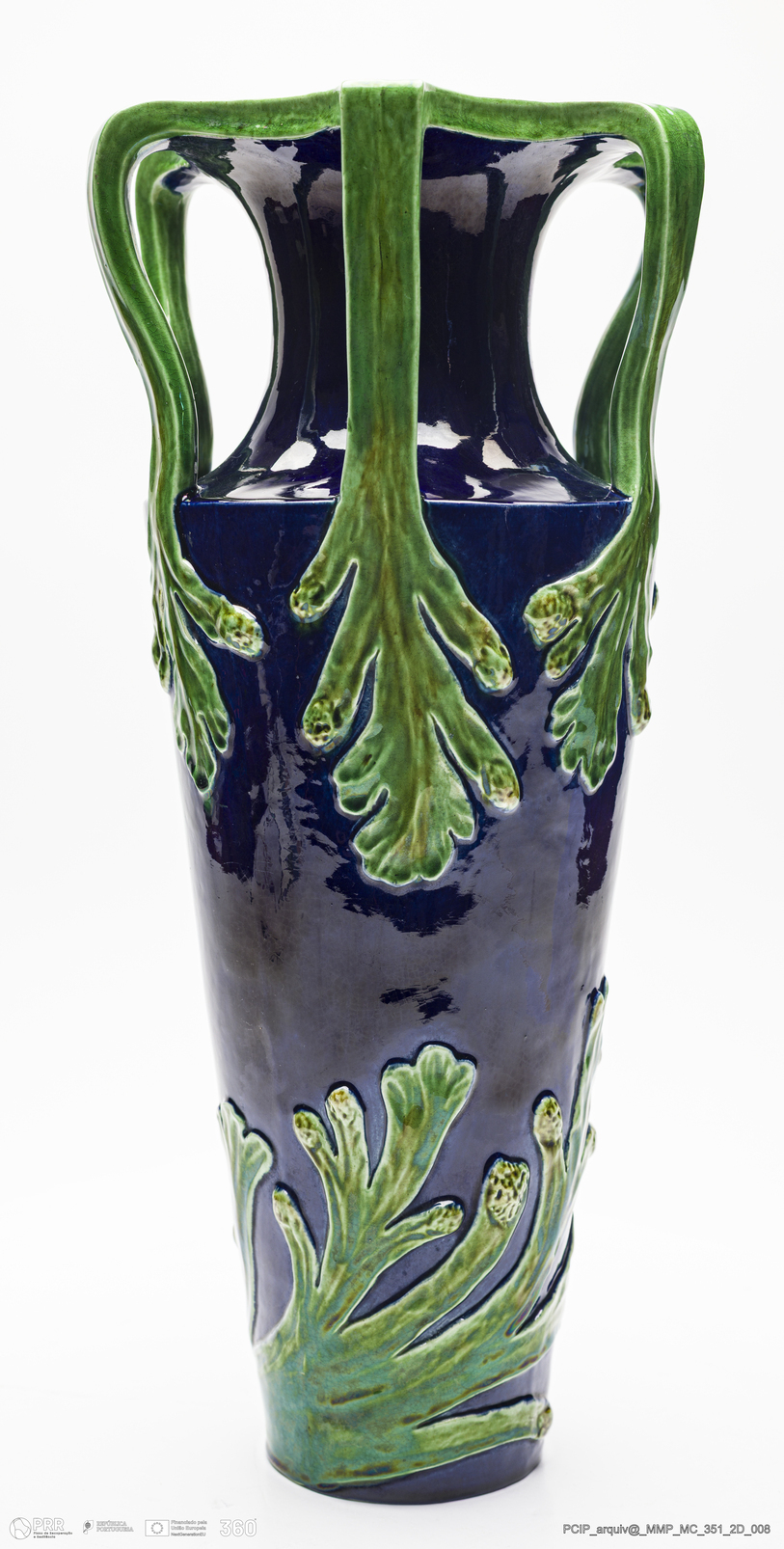 Matéria/Técnica: Barro vermelho modelado e moldado. Vidrado polícromo: azul de cobalto e verde de cobre; Cronologia: século XX; Autoria: Manuel Gustavo Bordalo Pinheiro / Fábrica Bordalo Pinheiro, Caldas da Rainha, Portugal; Dimensões (cm): Altura: 38,1; Largura: 18.