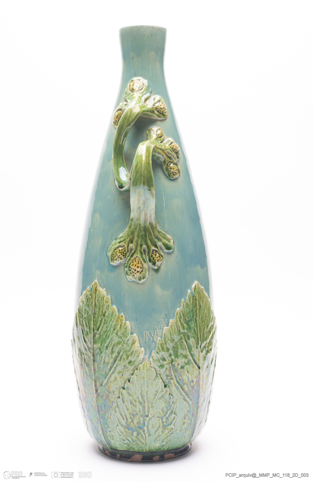 Matéria/Técnica: Barro vermelho moldado e modelado. Vidrado polícromo: azul, cinzento e verde; Cronologia: 1908; Autoria: Manuel Gustavo Bordalo Pinheiro / Fábrica Bordalo Pinheiro, Caldas da Rainha, Portugal; Dimensões (cm): Altura: 35,5; Largura: 16; Comprimento: 12.