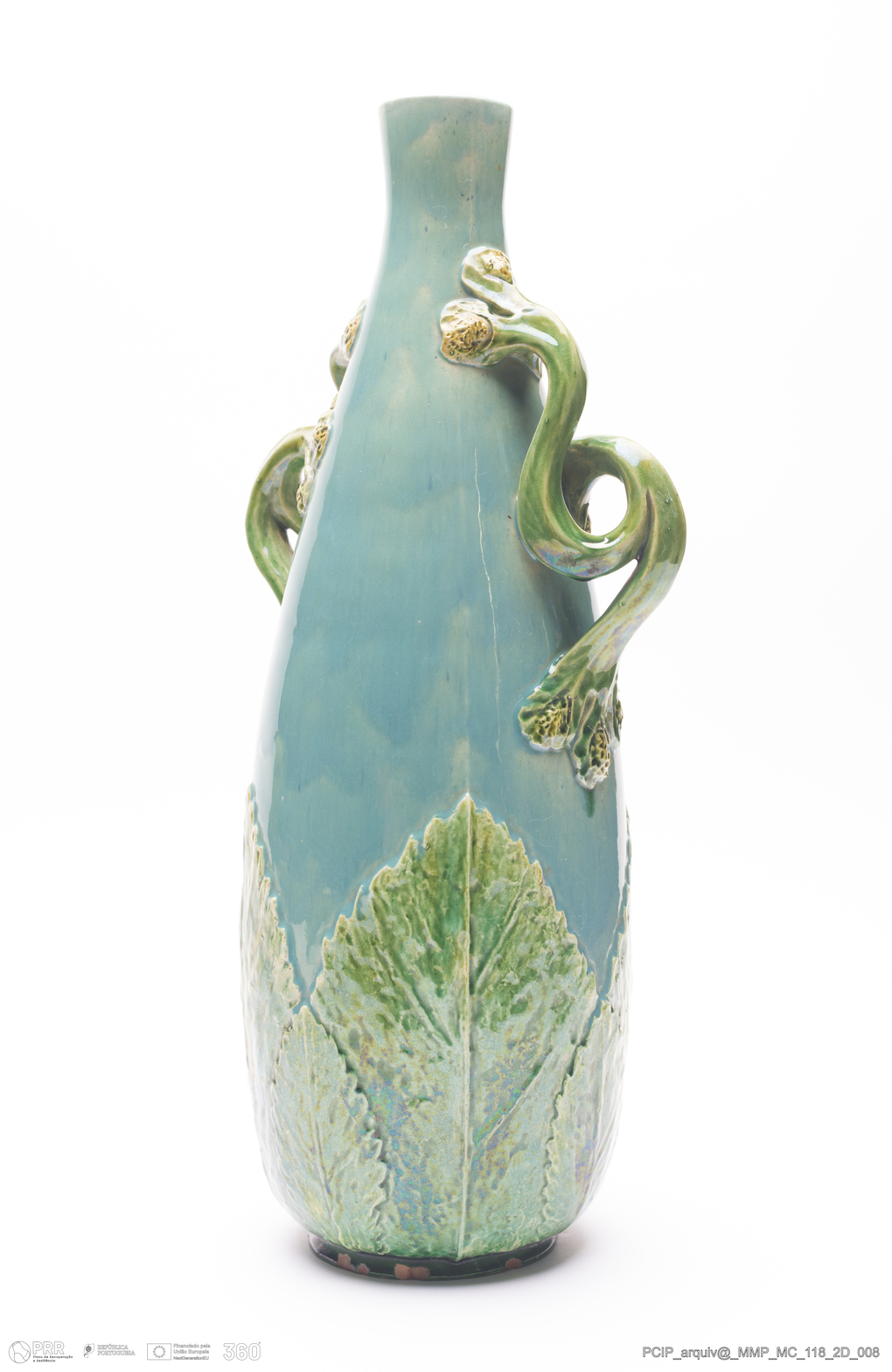 Matéria/Técnica: Barro vermelho moldado e modelado. Vidrado polícromo: azul, cinzento e verde; Cronologia: 1908; Autoria: Manuel Gustavo Bordalo Pinheiro / Fábrica Bordalo Pinheiro, Caldas da Rainha, Portugal; Dimensões (cm): Altura: 35,5; Largura: 16; Comprimento: 12.