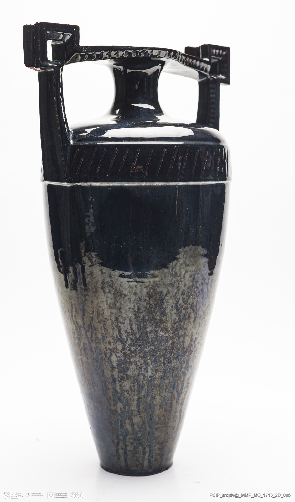 Matéria/Técnica: Barro vermelho rodado e moldado.. Vidrado monocromo a negro metalizado; Cronologia: 1908-1916; Autoria: António Augusto da Costa Motta / Fábrica de Faianças das Caldas da Rainha, Portugal; Dimensões (cm): Altura: 41,5; Largura: 24; Comprimento: 20.