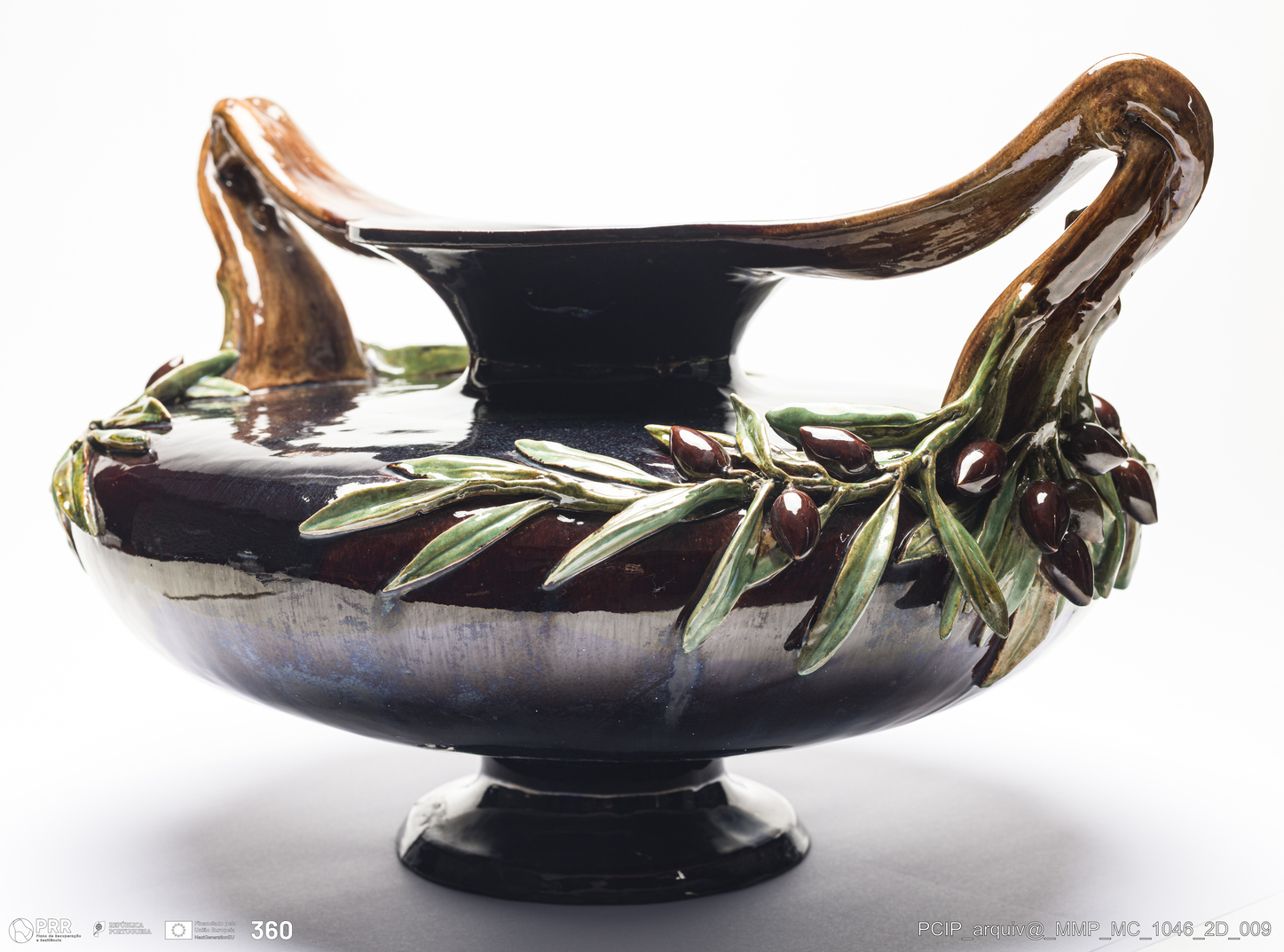 Matéria/Técnica: Barro vermelho rodado e modelado. Vidrado polícromo: castanho e verde; Cronologia: 1912; Autoria: António Augusto da Costa Motta / Fábrica De Faianças das Caldas da Rainha, Portugal; Dimensões (cm): Altura: 31; Largura: 50; Comprimento: 42.