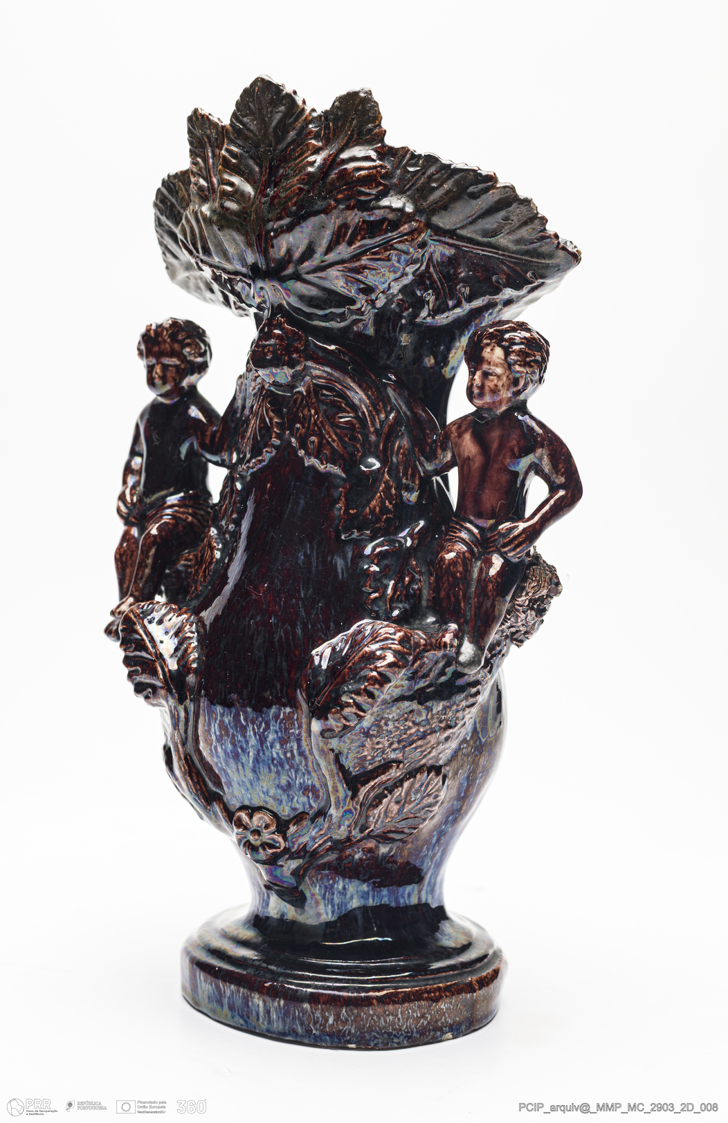 Matéria/Técnica: Barro branco moldado. Vidrado monocromo castanho escuro; Cronologia: 1870-1887; Autoria: Manuel Cipriano Gomes Mafra / Fábrica Manuel Cipriano Gomes O Mafra, Caldas da Rainha, Portugal; Dimensões (cm): Altura: 27,5; Largura: 16,5.