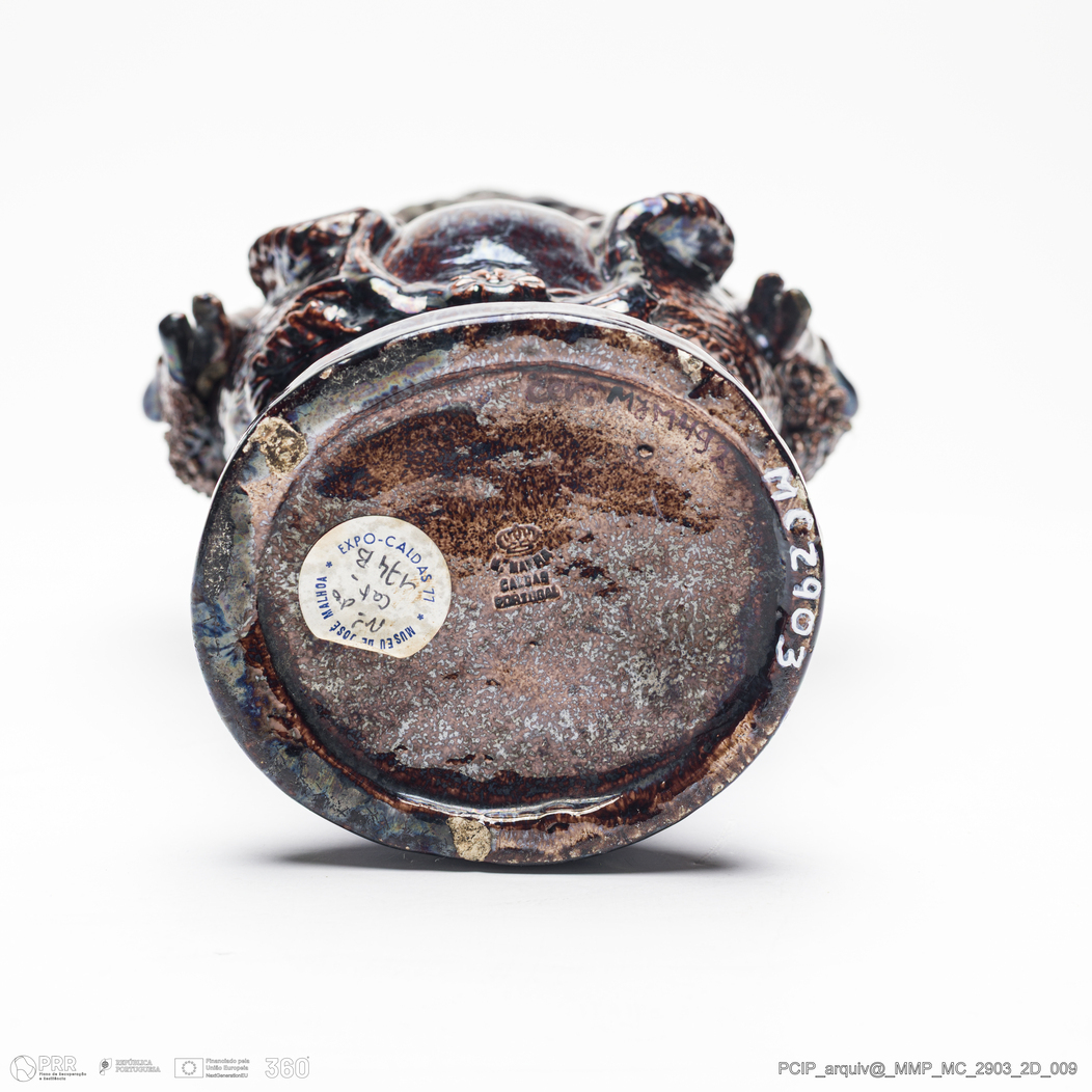 Matéria/Técnica: Barro branco moldado. Vidrado monocromo castanho escuro; Cronologia: 1870-1887; Autoria: Manuel Cipriano Gomes Mafra / Fábrica Manuel Cipriano Gomes O Mafra, Caldas da Rainha, Portugal; Dimensões (cm): Altura: 27,5; Largura: 16,5.