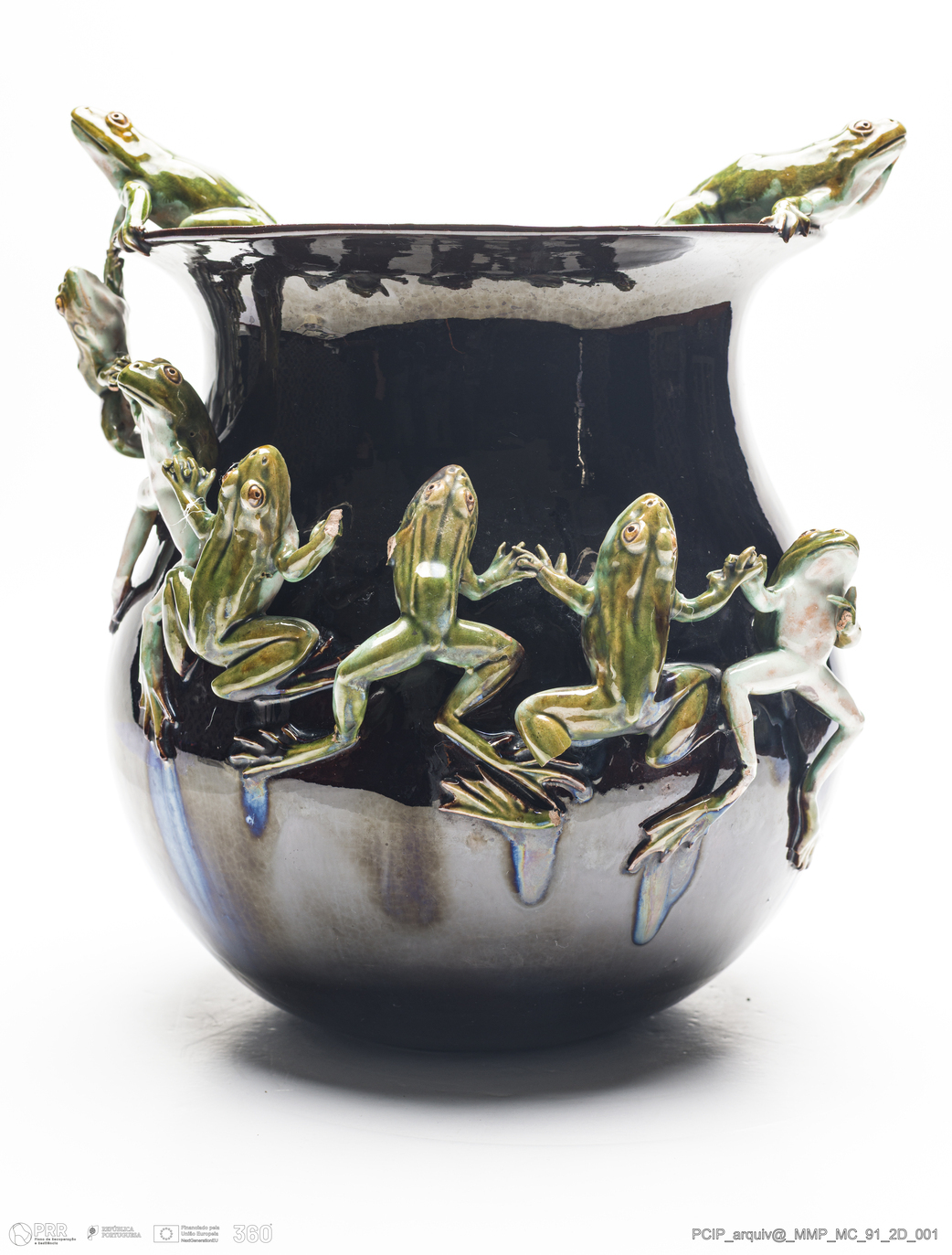 Matéria/Técnica: Barro vermelho rodado e modelado. Vidrado polícromo: castanho, verde e branco; Cronologia: 1893; Autoria: Rafael Bordalo Pinheiro / Fábrica de Faianças Bordalo Pinheiro, Caldas da Rainha, Portugal; Dimensões (cm): Altura: 27,5; Largura: 24; Comprimento: 26.