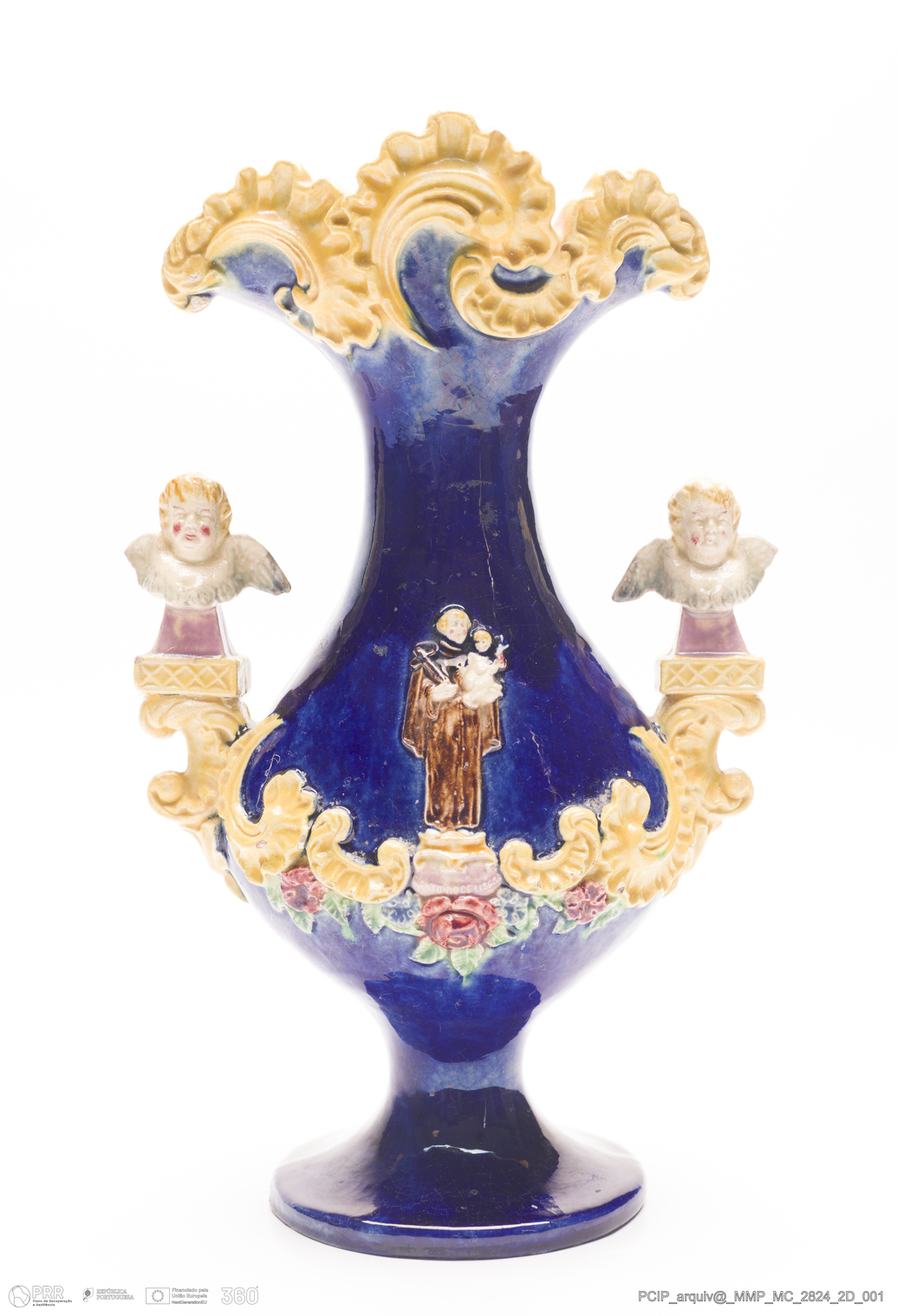 Matéria/Técnica: Barro branco moldado e modelado. Vidrado polícromo: castanho escuro e mel, camurça, violeta, magenta, azul cobalto e verde; Cronologia: 1889-1927; Autoria: Avelino António Soares Belo / Fábrica de Avelino António Soares Belo, Caldas da Rainha, Portugal; Dimensões (cm): Altura: 24,5; Largura: 15.