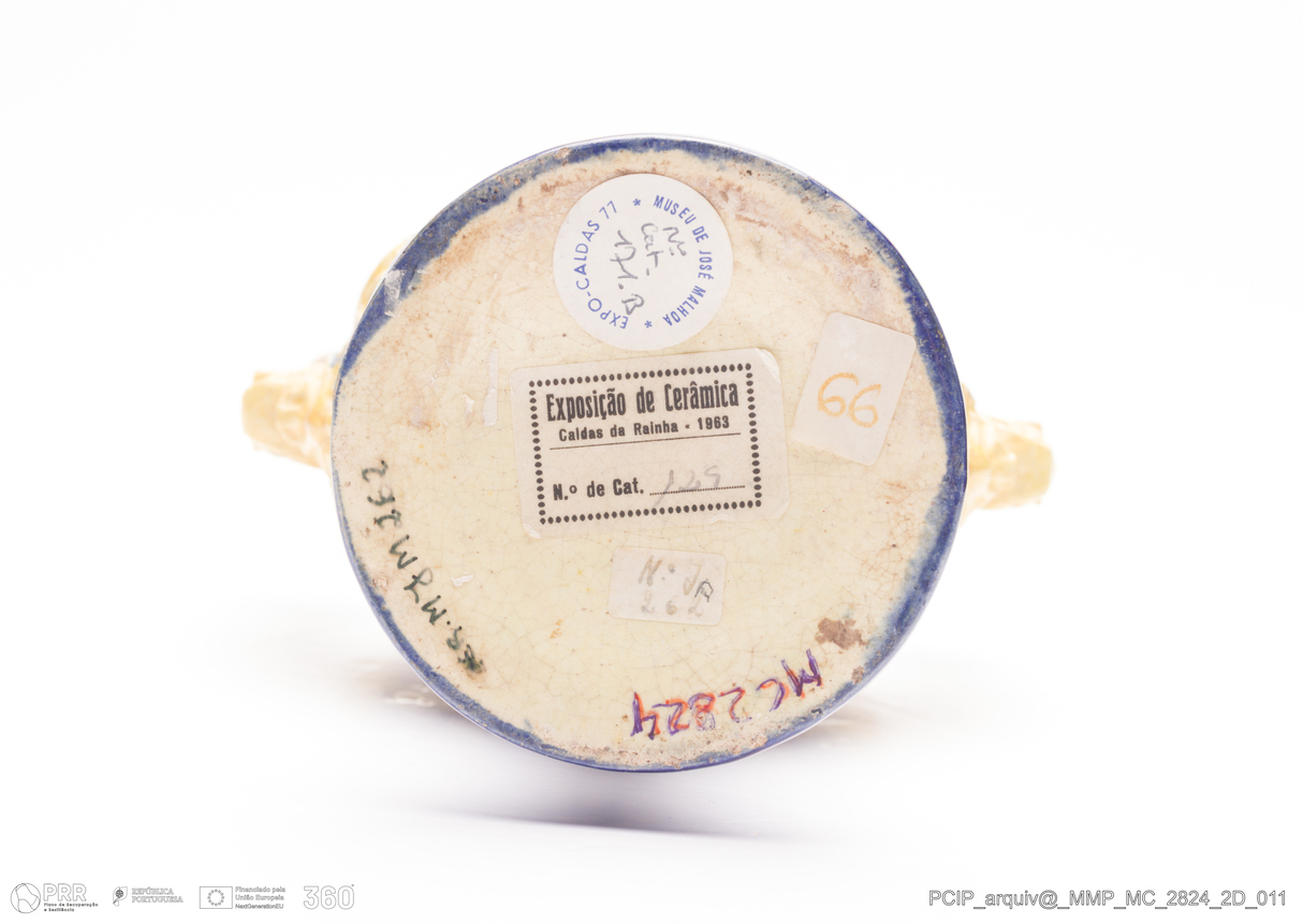 Matéria/Técnica: Barro branco moldado e modelado. Vidrado polícromo: castanho escuro e mel, camurça, violeta, magenta, azul cobalto e verde; Cronologia: 1889-1927; Autoria: Avelino António Soares Belo / Fábrica de Avelino António Soares Belo, Caldas da Rainha, Portugal; Dimensões (cm): Altura: 24,5; Largura: 15.