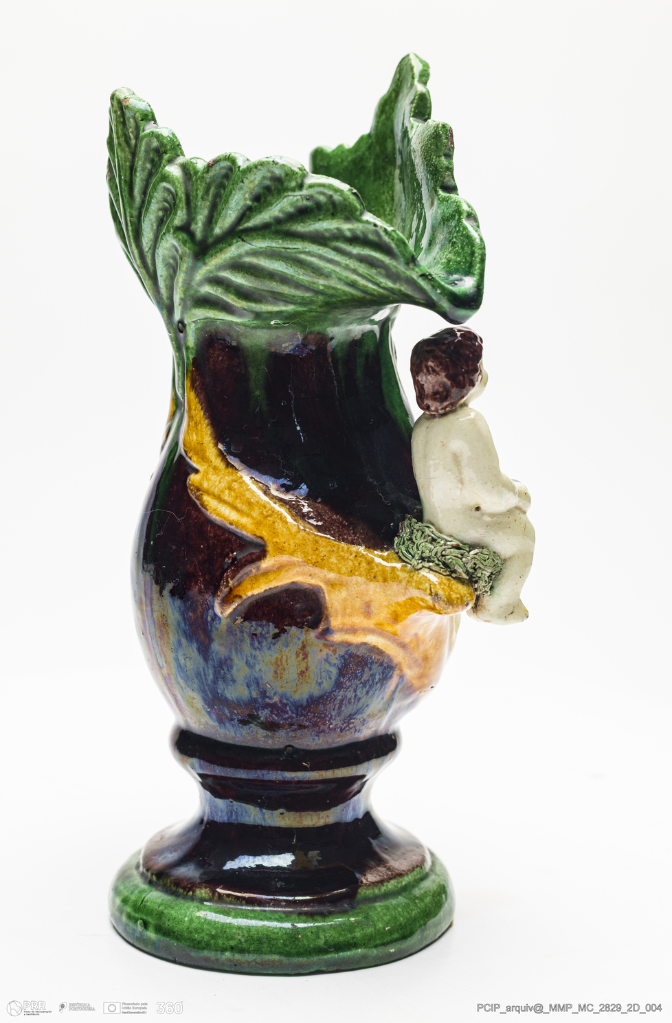 Matéria/Técnica: Barro moldado e modelado. Vidrado polícromo: castanho escuro e mel, verde, azul, vermelho e bege; Cronologia: 1870-1887; Autoria: Manuel Cipriano Gomes Mafra / Fábrica Manuel Cipriano Gomes O Mafra, Caldas da Rainha, Portugal; Dimensões (cm): Altura: 23; Largura: 10,5; Comprimento: 13.