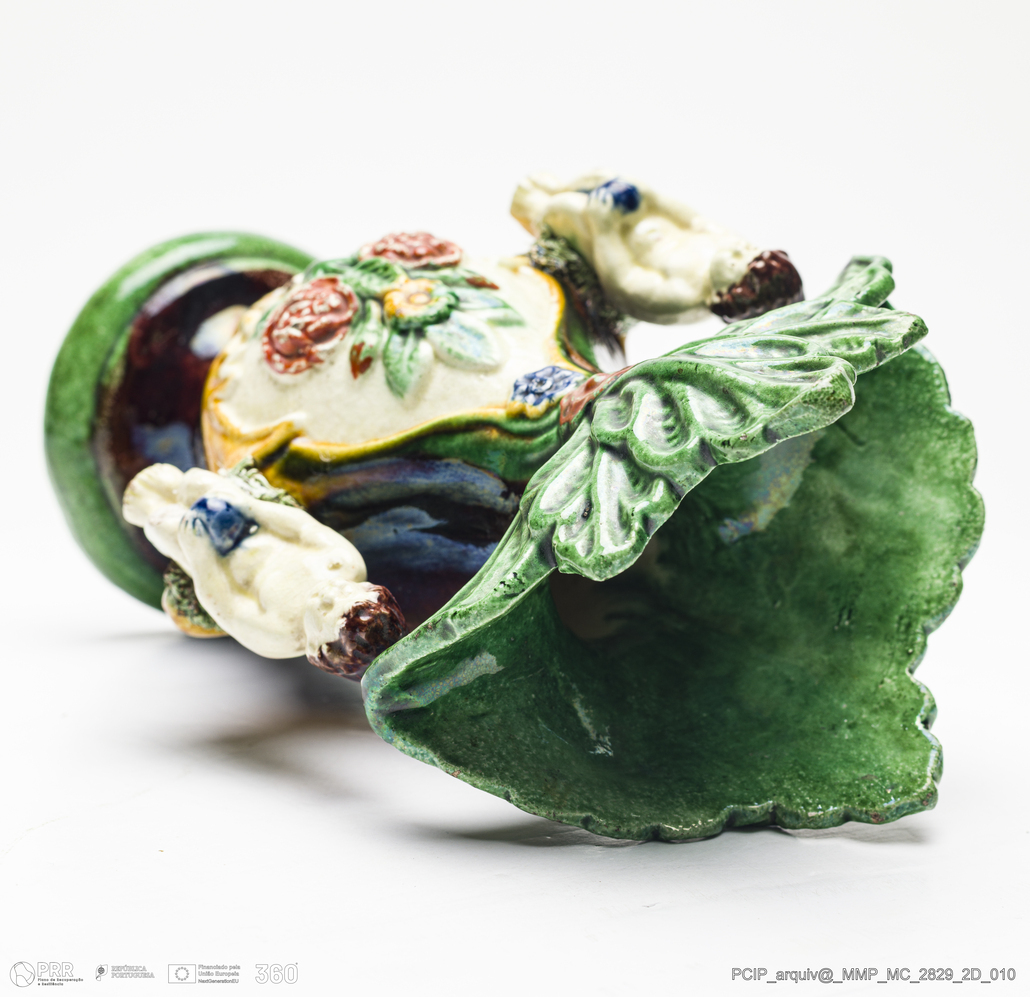 Matéria/Técnica: Barro moldado e modelado. Vidrado polícromo: castanho escuro e mel, verde, azul, vermelho e bege; Cronologia: 1870-1887; Autoria: Manuel Cipriano Gomes Mafra / Fábrica Manuel Cipriano Gomes O Mafra, Caldas da Rainha, Portugal; Dimensões (cm): Altura: 23; Largura: 10,5; Comprimento: 13.