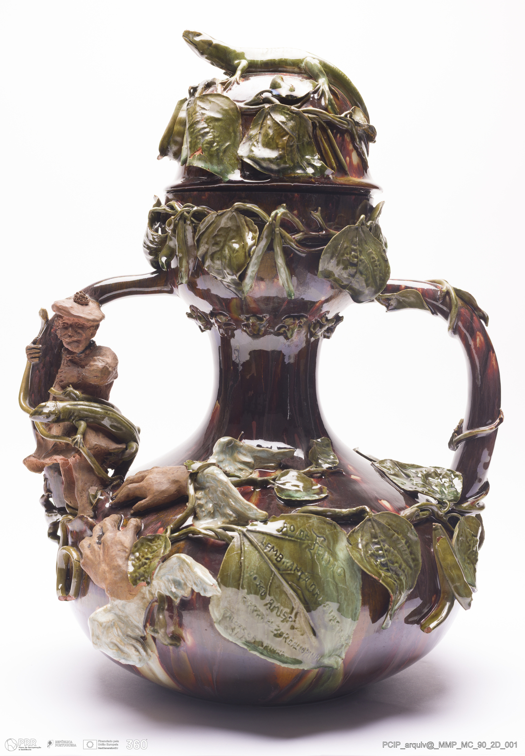 Matéria/Técnica: Barro vermelho moldado e modelado. Vidrado polícromo: castanho escuro e mel, verde; Cronologia: 1888; Autoria: Rafael Bordalo Pinheiro / Fábrica de Faianças Bordalo Pinheiro, Caldas da Rainha, Portugal; Dimensões (cm): Altura: 40; Largura: 31; Comprimento: 30.