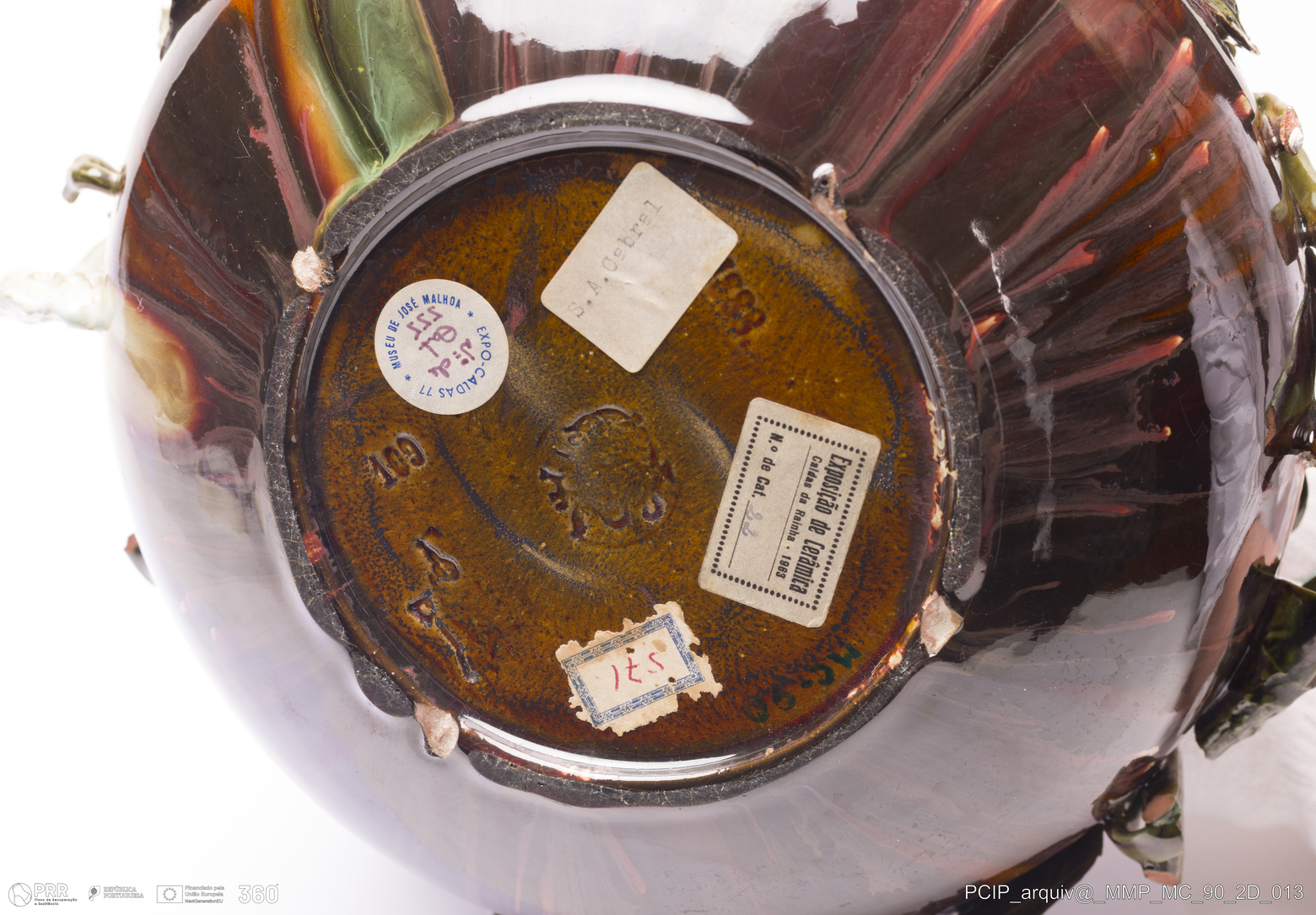 Matéria/Técnica: Barro vermelho moldado e modelado. Vidrado polícromo: castanho escuro e mel, verde; Cronologia: 1888; Autoria: Rafael Bordalo Pinheiro / Fábrica de Faianças Bordalo Pinheiro, Caldas da Rainha, Portugal; Dimensões (cm): Altura: 40; Largura: 31; Comprimento: 30.