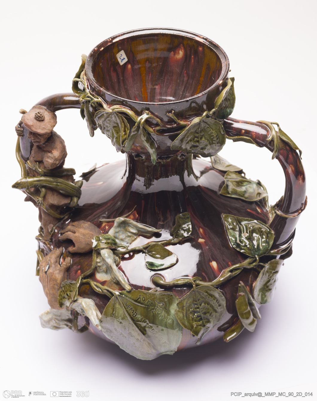 Matéria/Técnica: Barro vermelho moldado e modelado. Vidrado polícromo: castanho escuro e mel, verde; Cronologia: 1888; Autoria: Rafael Bordalo Pinheiro / Fábrica de Faianças Bordalo Pinheiro, Caldas da Rainha, Portugal; Dimensões (cm): Altura: 40; Largura: 31; Comprimento: 30.