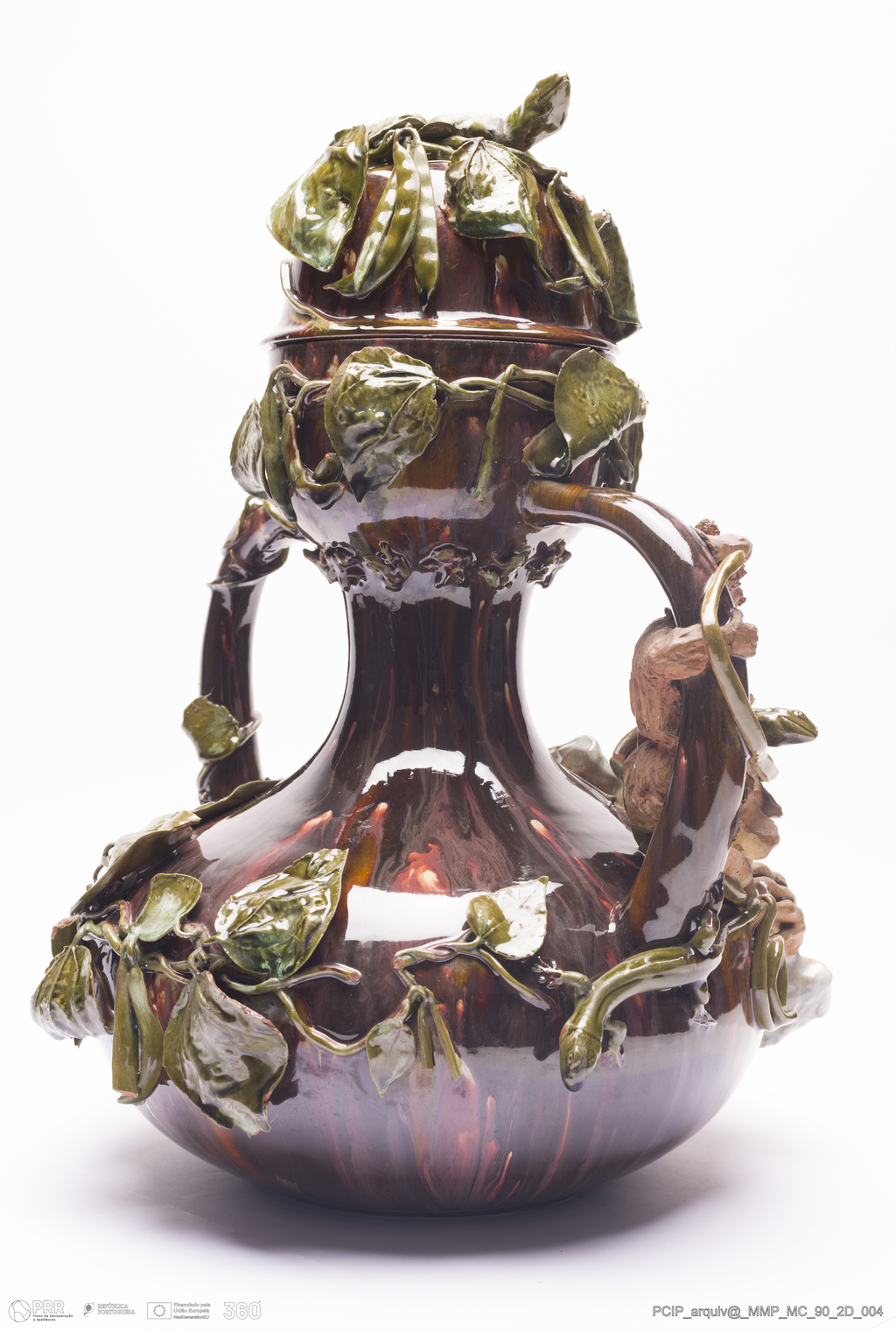 Matéria/Técnica: Barro vermelho moldado e modelado. Vidrado polícromo: castanho escuro e mel, verde; Cronologia: 1888; Autoria: Rafael Bordalo Pinheiro / Fábrica de Faianças Bordalo Pinheiro, Caldas da Rainha, Portugal; Dimensões (cm): Altura: 40; Largura: 31; Comprimento: 30.