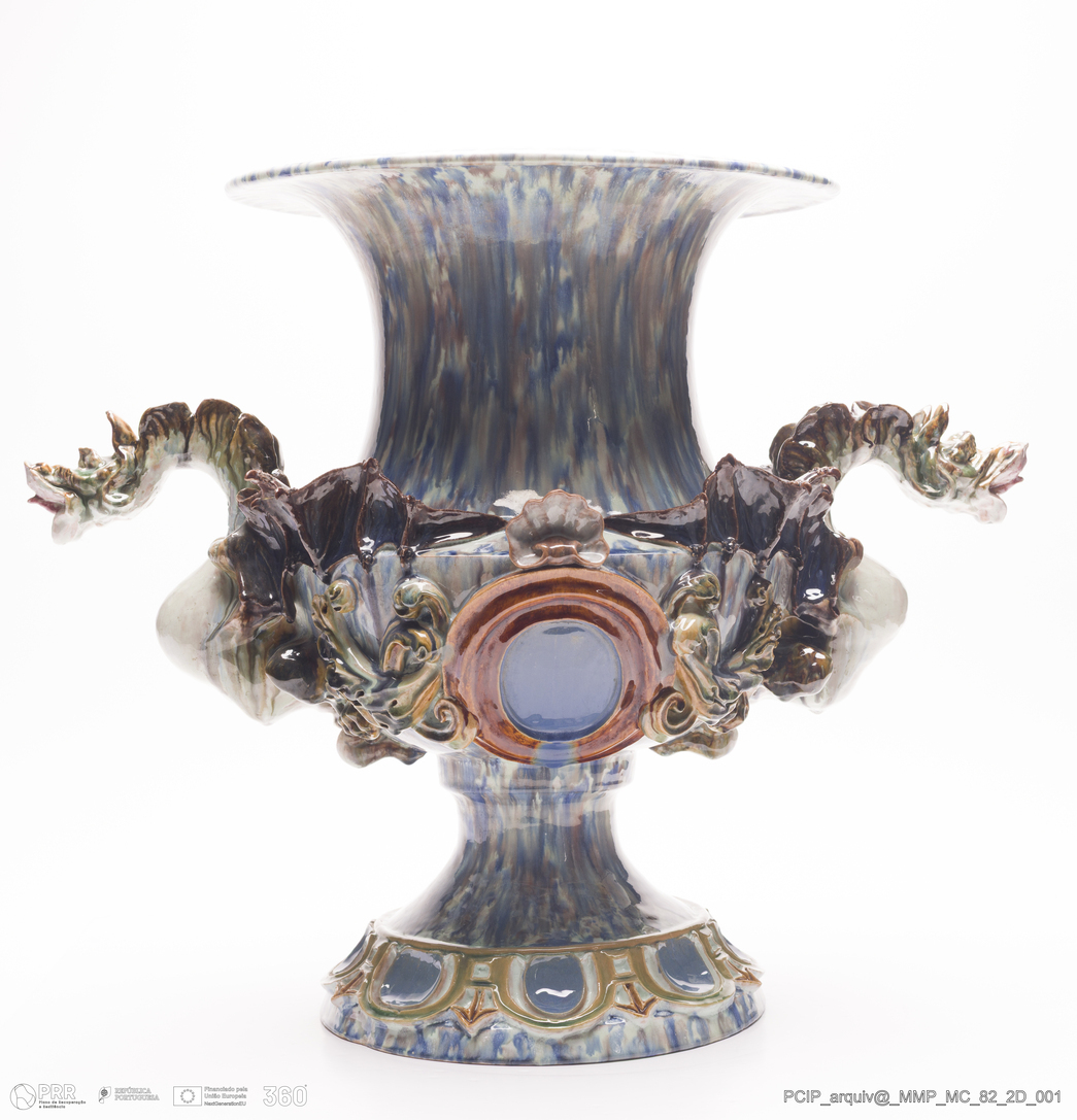 Matéria/Técnica: Barro vermelho moldado e modelado. Vidrado polícromo: azul, castanho escuro e mel, verde e bege. Escorridos; Cronologia: 1895; Autoria: Rafael Bordalo Pinheiro / Fábrica de Faianças Bordalo Pinheiro, Caldas da Rainha, Portugal; Dimensões (cm): Altura: 43,2; Largura: 52,5.
