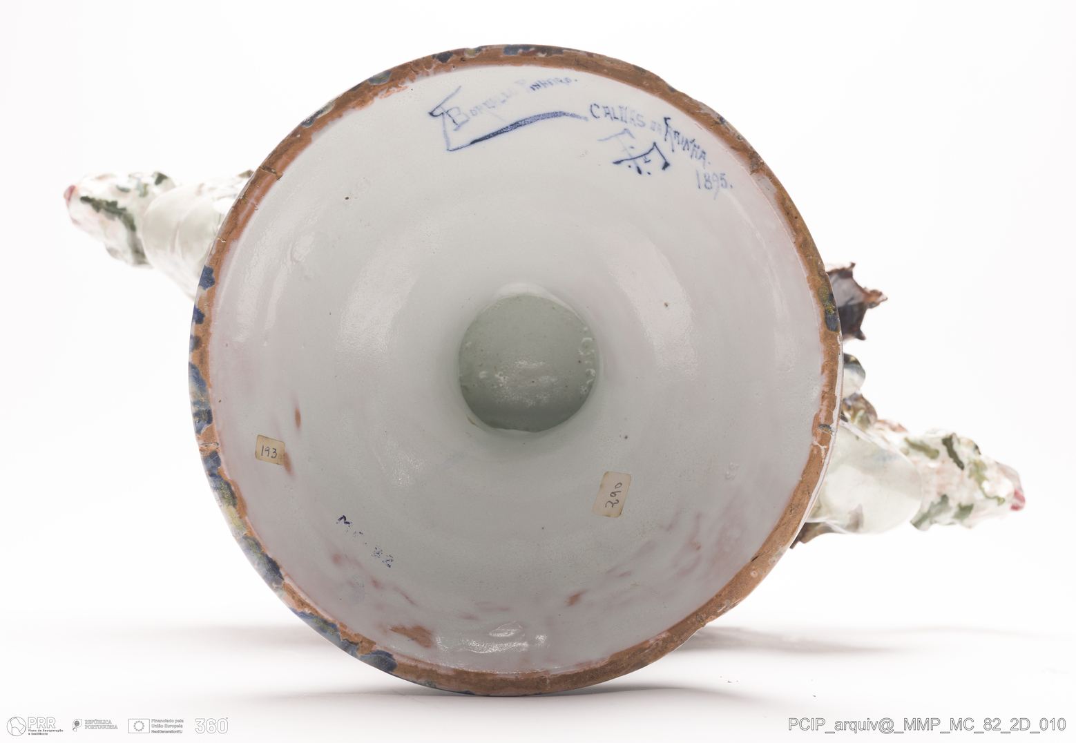 Matéria/Técnica: Barro vermelho moldado e modelado. Vidrado polícromo: azul, castanho escuro e mel, verde e bege. Escorridos; Cronologia: 1895; Autoria: Rafael Bordalo Pinheiro / Fábrica de Faianças Bordalo Pinheiro, Caldas da Rainha, Portugal; Dimensões (cm): Altura: 43,2; Largura: 52,5.