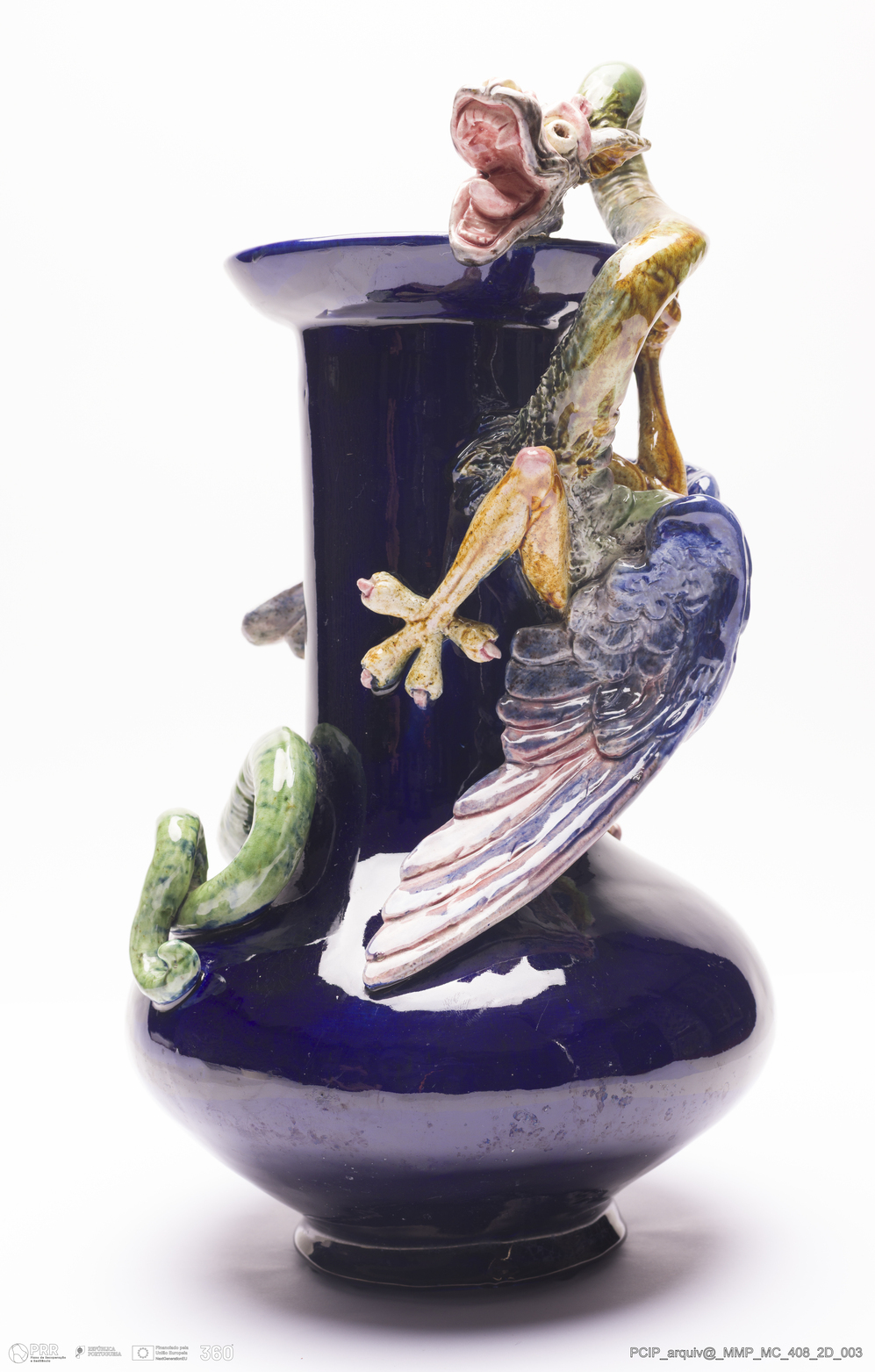 Matéria/Técnica: Barro vermelho moldado e modelado. Vidrado polícromo: azul, amarelo, rosa e verde; Cronologia: 1892-1896; Autoria: Desconhecido / Atelier Cerâmico, Caldas da Rainha, Portugal; Dimensões (cm): Altura: 35; Largura: 20.