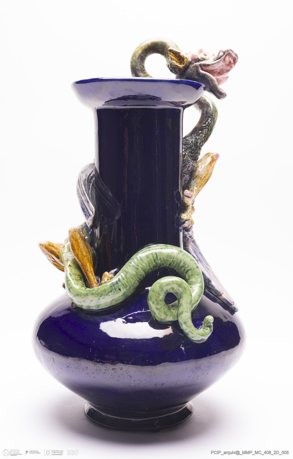 Matéria/Técnica: Barro vermelho moldado e modelado. Vidrado polícromo: azul, amarelo, rosa e verde; Cronologia: 1892-1896; Autoria: Desconhecido / Atelier Cerâmico, Caldas da Rainha, Portugal; Dimensões (cm): Altura: 35; Largura: 20.