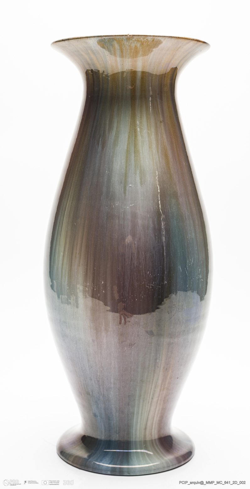 Matéria/Técnica: Barro rodado e modelado. Vidrado polícromo: camurça com sobre posição de escorridos em tons de azul e castanhos; Cronologia: 1908-1922; Autoria: Manuel Gustavo Bordalo Pinheiro / Fábrica Bordalo Pinheiro, Caldas da Rainha, Portugal; Dimensões (cm): Altura: 37,5; Diâmetro: 15 ,5.