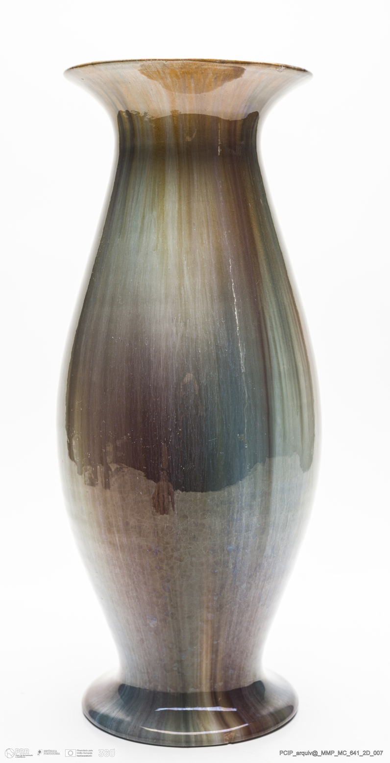 Matéria/Técnica: Barro rodado e modelado. Vidrado polícromo: camurça com sobre posição de escorridos em tons de azul e castanhos; Cronologia: 1908-1922; Autoria: Manuel Gustavo Bordalo Pinheiro / Fábrica Bordalo Pinheiro, Caldas da Rainha, Portugal; Dimensões (cm): Altura: 37,5; Diâmetro: 15 ,5.
