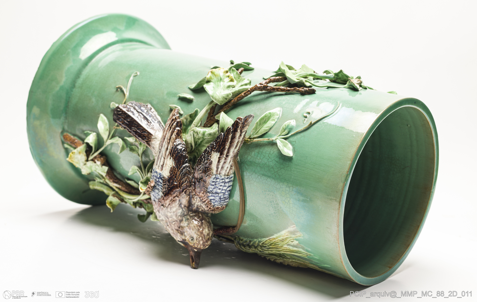 Matéria/Técnica: Barro branco moldado e modelado. Vidrado polícromo: cinzento, azul, castanho escuro e mel, verde e amarelo; Cronologia: 1900; Autoria: Rafael Bordalo Pinheiro / Fábrica de Faianças Bordalo Pinheiro, Caldas da Rainha, Portugal; Dimensões (cm): Altura: 41; Diâmetro: 25.