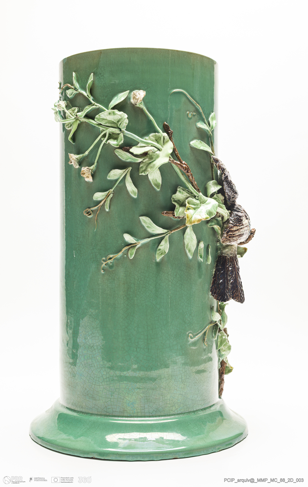 Matéria/Técnica: Barro branco moldado e modelado. Vidrado polícromo: cinzento, azul, castanho escuro e mel, verde e amarelo; Cronologia: 1900; Autoria: Rafael Bordalo Pinheiro / Fábrica de Faianças Bordalo Pinheiro, Caldas da Rainha, Portugal; Dimensões (cm): Altura: 41; Diâmetro: 25.