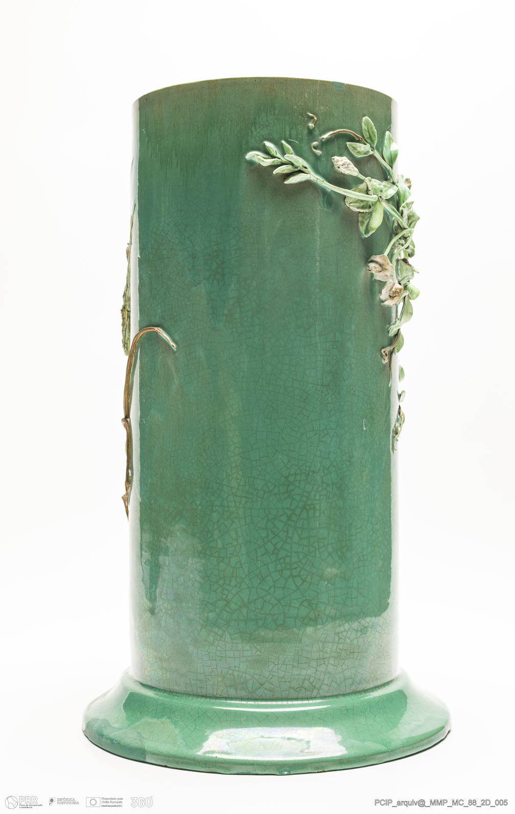 Matéria/Técnica: Barro branco moldado e modelado. Vidrado polícromo: cinzento, azul, castanho escuro e mel, verde e amarelo; Cronologia: 1900; Autoria: Rafael Bordalo Pinheiro / Fábrica de Faianças Bordalo Pinheiro, Caldas da Rainha, Portugal; Dimensões (cm): Altura: 41; Diâmetro: 25.