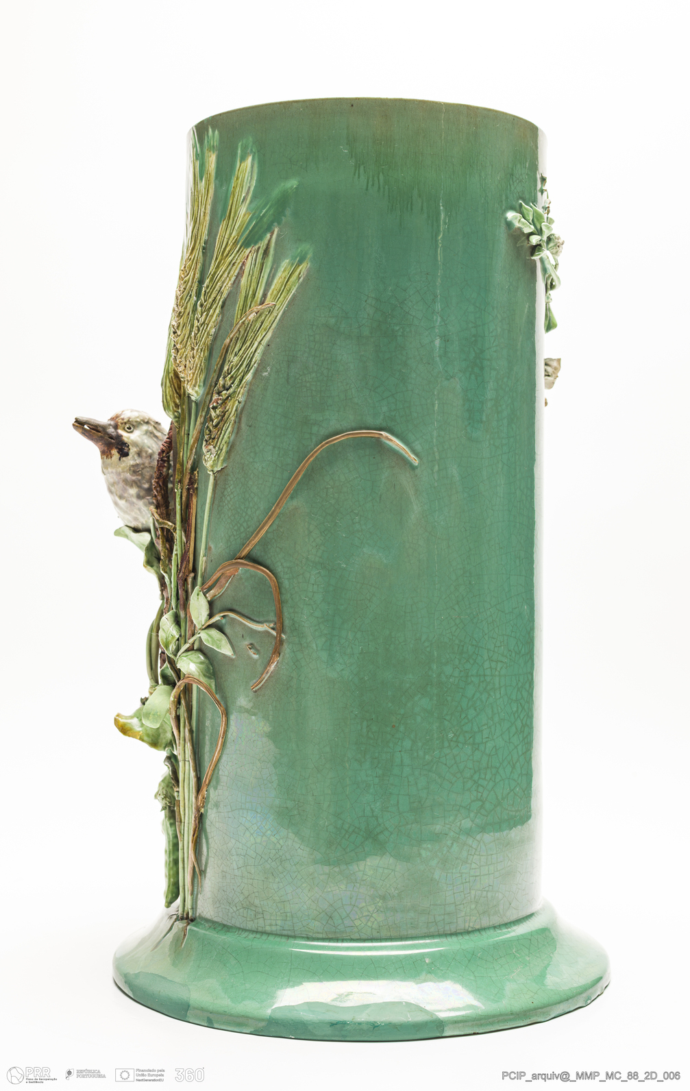 Matéria/Técnica: Barro branco moldado e modelado. Vidrado polícromo: cinzento, azul, castanho escuro e mel, verde e amarelo; Cronologia: 1900; Autoria: Rafael Bordalo Pinheiro / Fábrica de Faianças Bordalo Pinheiro, Caldas da Rainha, Portugal; Dimensões (cm): Altura: 41; Diâmetro: 25.