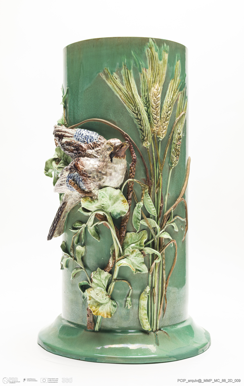 Matéria/Técnica: Barro branco moldado e modelado. Vidrado polícromo: cinzento, azul, castanho escuro e mel, verde e amarelo; Cronologia: 1900; Autoria: Rafael Bordalo Pinheiro / Fábrica de Faianças Bordalo Pinheiro, Caldas da Rainha, Portugal; Dimensões (cm): Altura: 41; Diâmetro: 25.