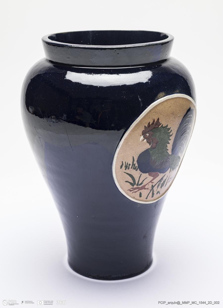 Matéria/Técnica: Barro rodado. Vidrado azul escuro com embutido vidrado; Cronologia: 1908; Autoria: Manuel Gustavo Bordalo Pinheiro / Fábrica Bordalo Pinheiro, Caldas da Rainha, Portugal; Dimensões (cm): Altura: 18,5; Diâmetro: 16.