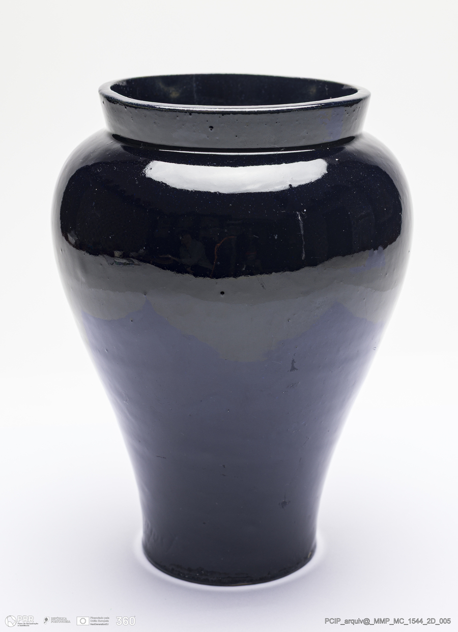 Matéria/Técnica: Barro rodado. Vidrado azul escuro com embutido vidrado; Cronologia: 1908; Autoria: Manuel Gustavo Bordalo Pinheiro / Fábrica Bordalo Pinheiro, Caldas da Rainha, Portugal; Dimensões (cm): Altura: 18,5; Diâmetro: 16.