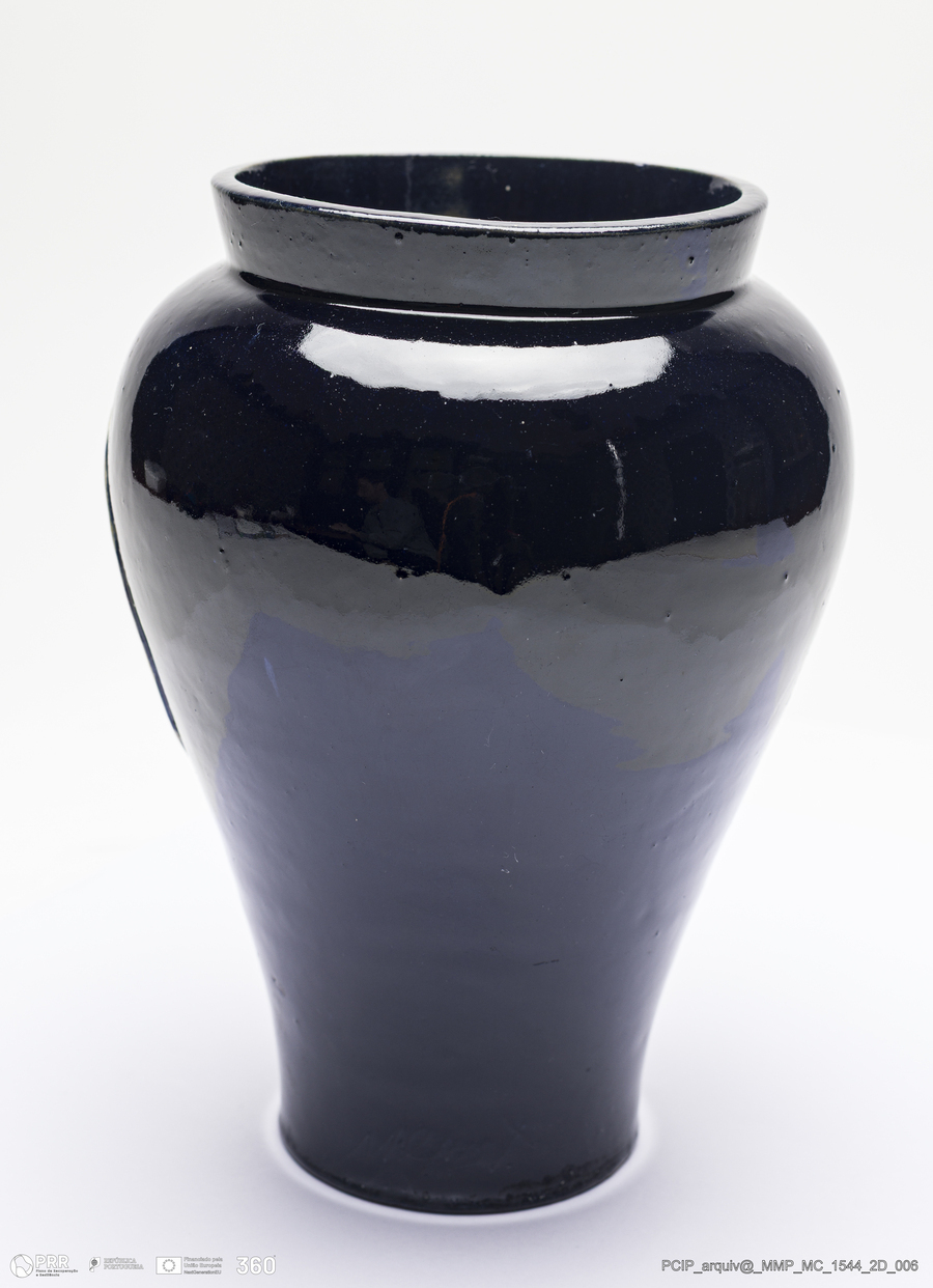 Matéria/Técnica: Barro rodado. Vidrado azul escuro com embutido vidrado; Cronologia: 1908; Autoria: Manuel Gustavo Bordalo Pinheiro / Fábrica Bordalo Pinheiro, Caldas da Rainha, Portugal; Dimensões (cm): Altura: 18,5; Diâmetro: 16.