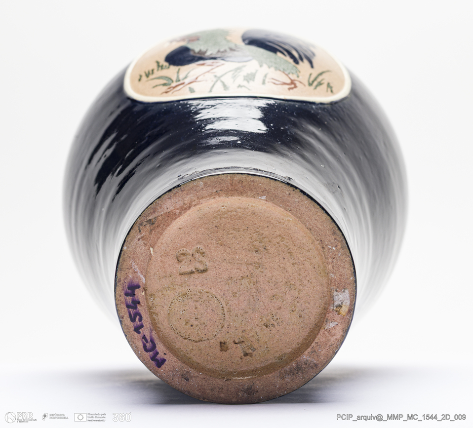 Matéria/Técnica: Barro rodado. Vidrado azul escuro com embutido vidrado; Cronologia: 1908; Autoria: Manuel Gustavo Bordalo Pinheiro / Fábrica Bordalo Pinheiro, Caldas da Rainha, Portugal; Dimensões (cm): Altura: 18,5; Diâmetro: 16.
