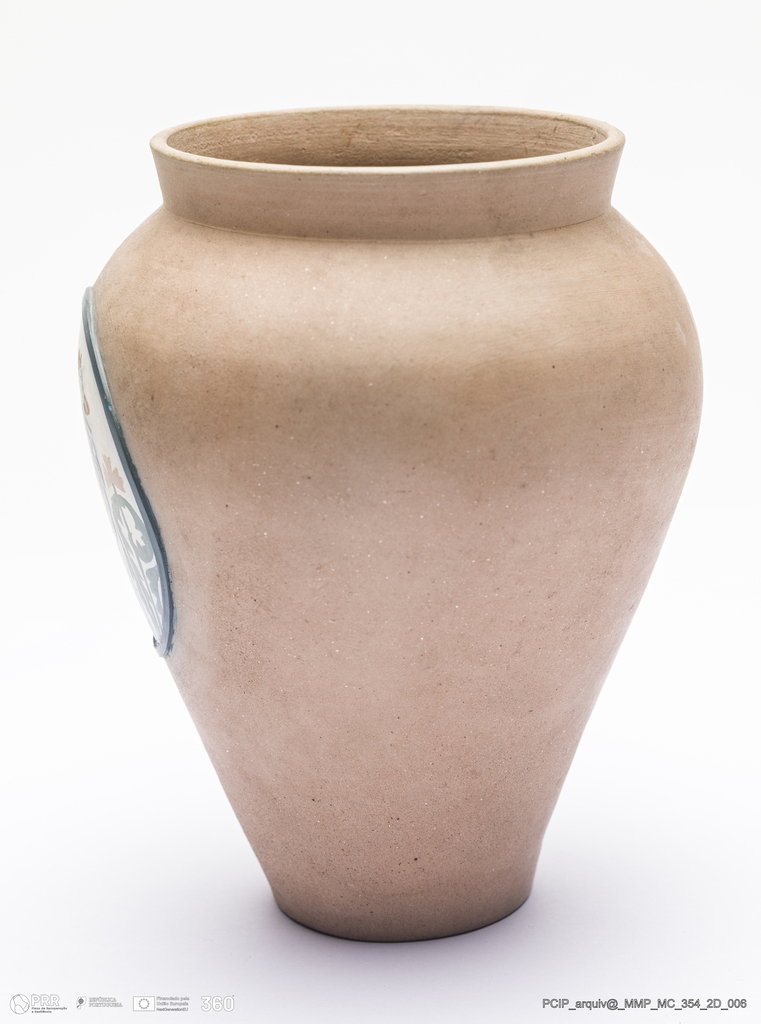 Matéria/Técnica: Barro amarelo rodado. Barro amarelo cozido, com medalhão em cloisonné: azul, vermelho, branco, verde e amarelo; Cronologia: 1908; Autoria: Manuel Gustavo Bordalo Pinheiro / Fábrica Bordalo Pinheiro, Caldas da Rainha, Portugal; Dimensões (cm): Altura: 15; Diâmetro: 12,5.