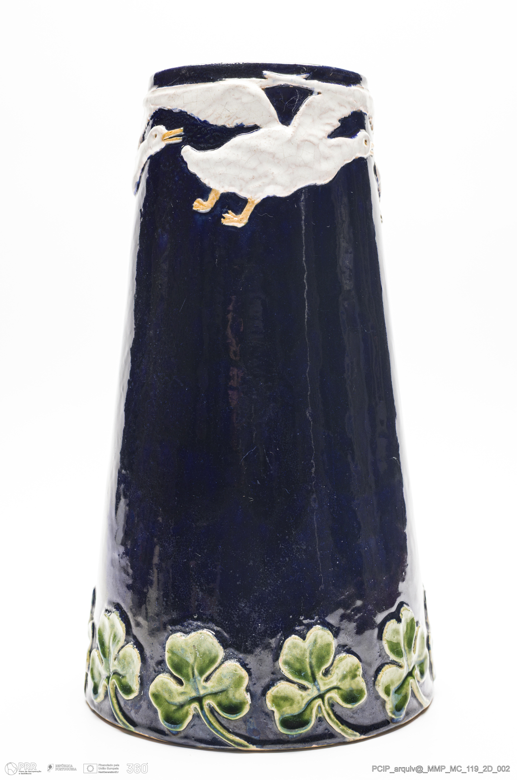 Matéria/Técnica: Barro moldado. Vidrado polícromo: preto, branco, amarelo e verde; Cronologia: 1906; Autoria: Manuel Gustavo Bordalo Pinheiro / Fábrica Bordalo Pinheiro, Caldas da Rainha, Portugal; Dimensões (cm): Altura: 26; Diâmetro: 18.