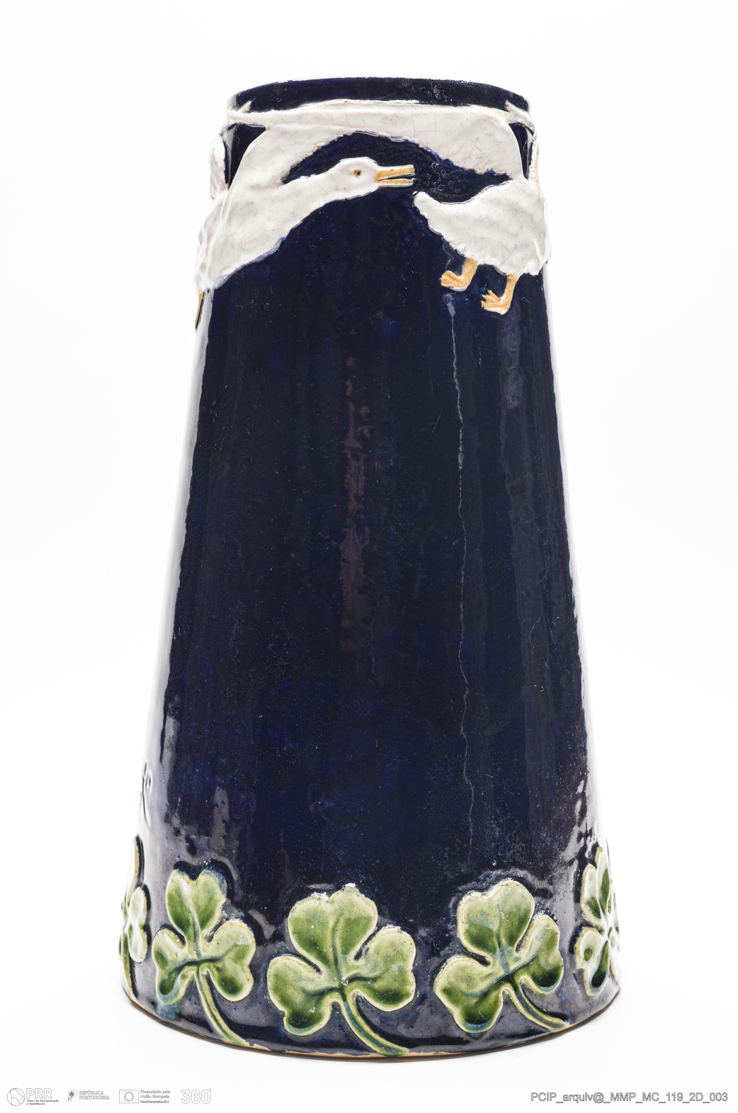 Matéria/Técnica: Barro moldado. Vidrado polícromo: preto, branco, amarelo e verde; Cronologia: 1906; Autoria: Manuel Gustavo Bordalo Pinheiro / Fábrica Bordalo Pinheiro, Caldas da Rainha, Portugal; Dimensões (cm): Altura: 26; Diâmetro: 18.